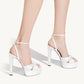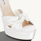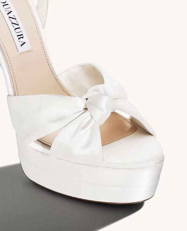Detalhes: sandália Aquazzura na cor branca, possui material acetinado, detalhe em laço, salto e plataforma e fecho em fivela no calcanhar.