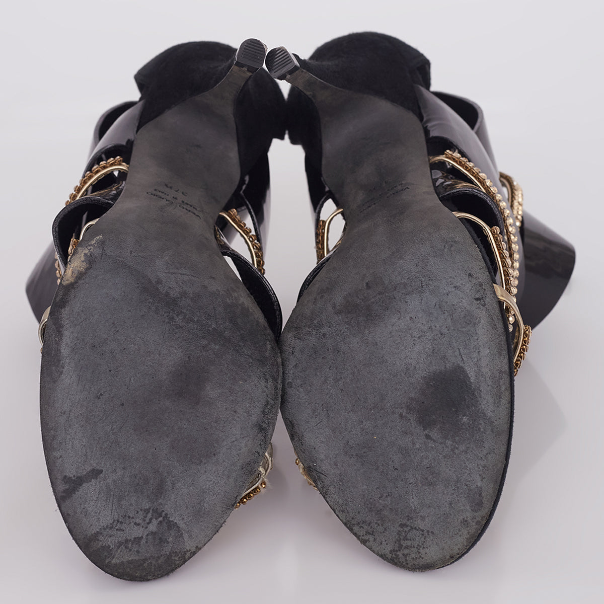 Estado da peça: Usado, em ótimo estado. Apresenta leves marquinhas no verniz, alguns strass faltando e sinais de uso nas solas.