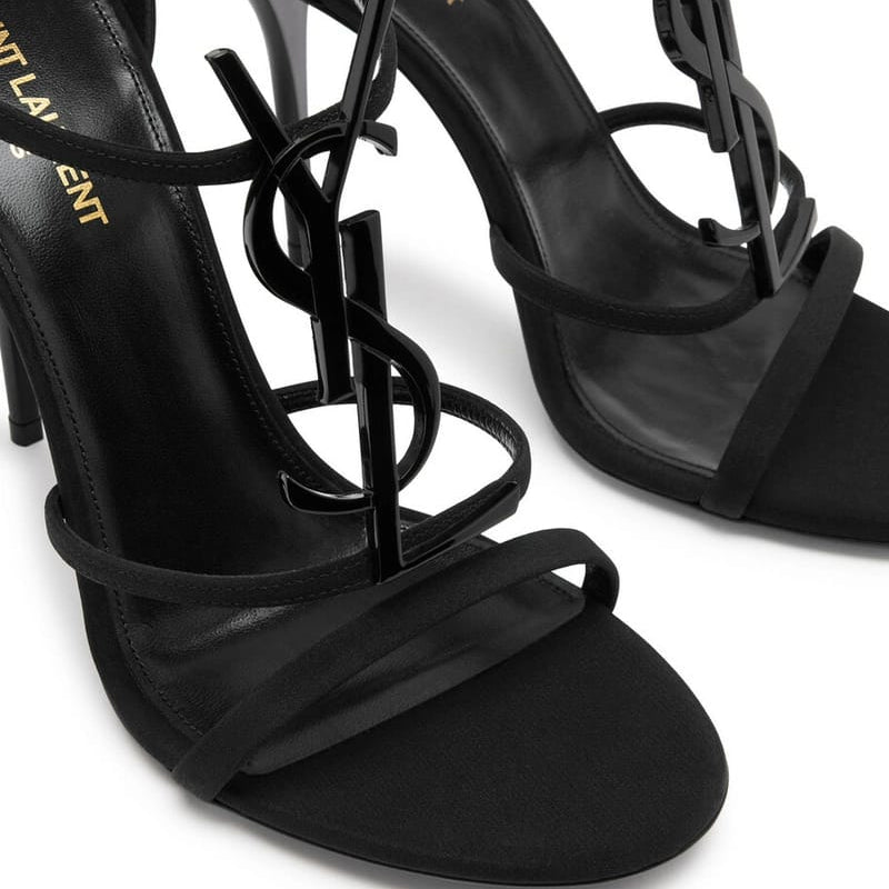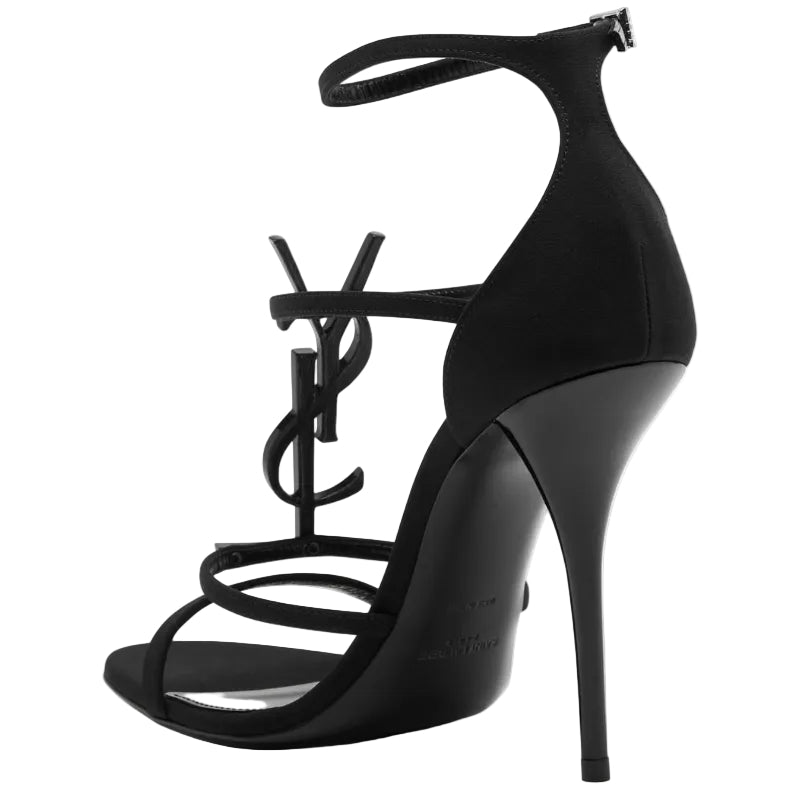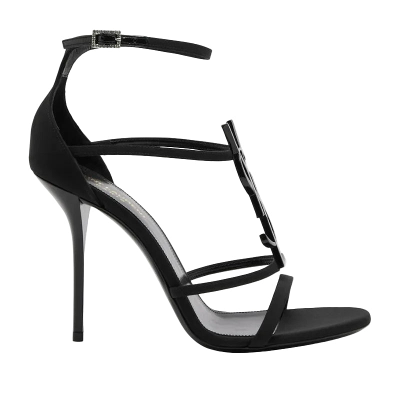 Detalhes: Sandália Saint Laurent Cassandra confeccionada em couro e tecido na cor preta, possui bico arredondado, salto alto e fino, tiras vazadas e detalhe de logo brilhante YSL no peito do pé. Fechamento lateral por fivelas de ajuste com strass.