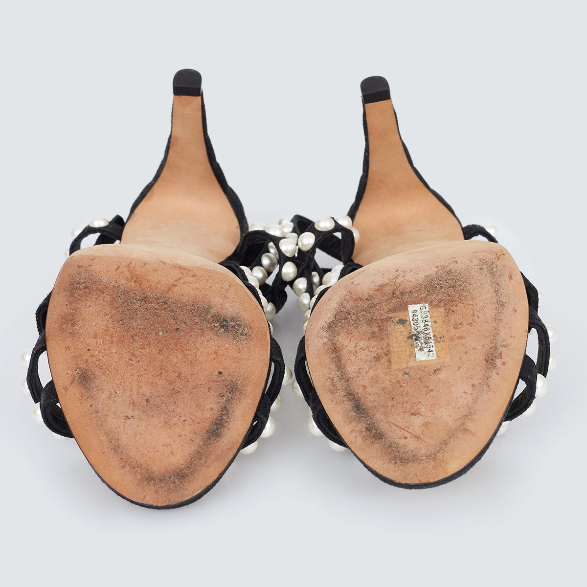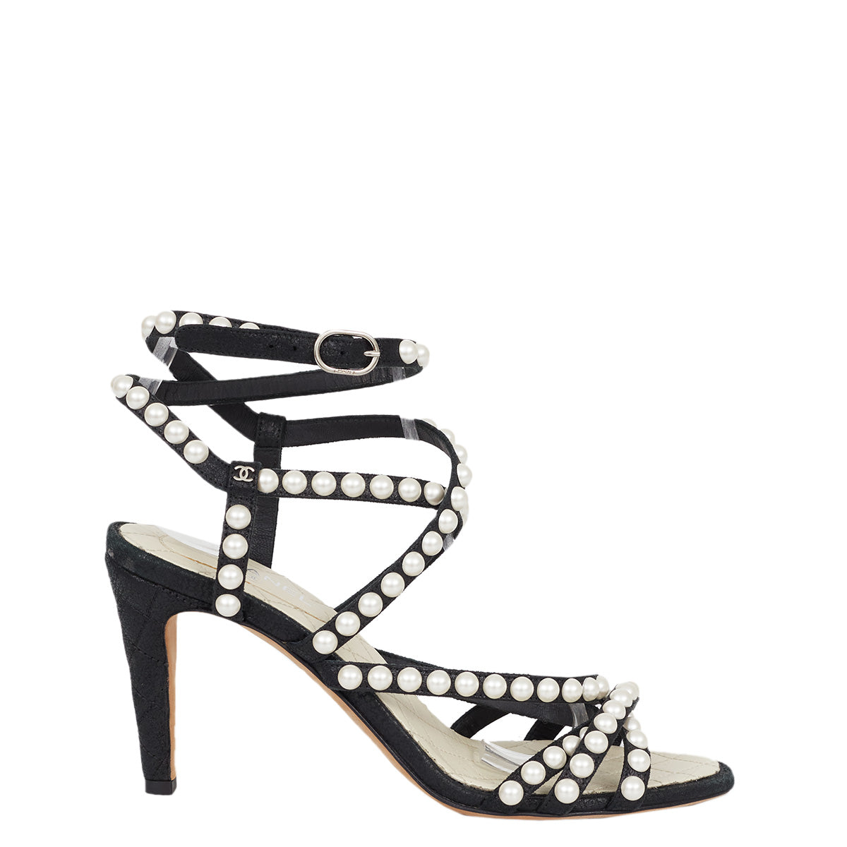 Detalhes: Sandália Chanel, confeccionada em couro nas cor preta. Possui aplicações de pérolas e palminha em matelassê. Acompanha dust da marca