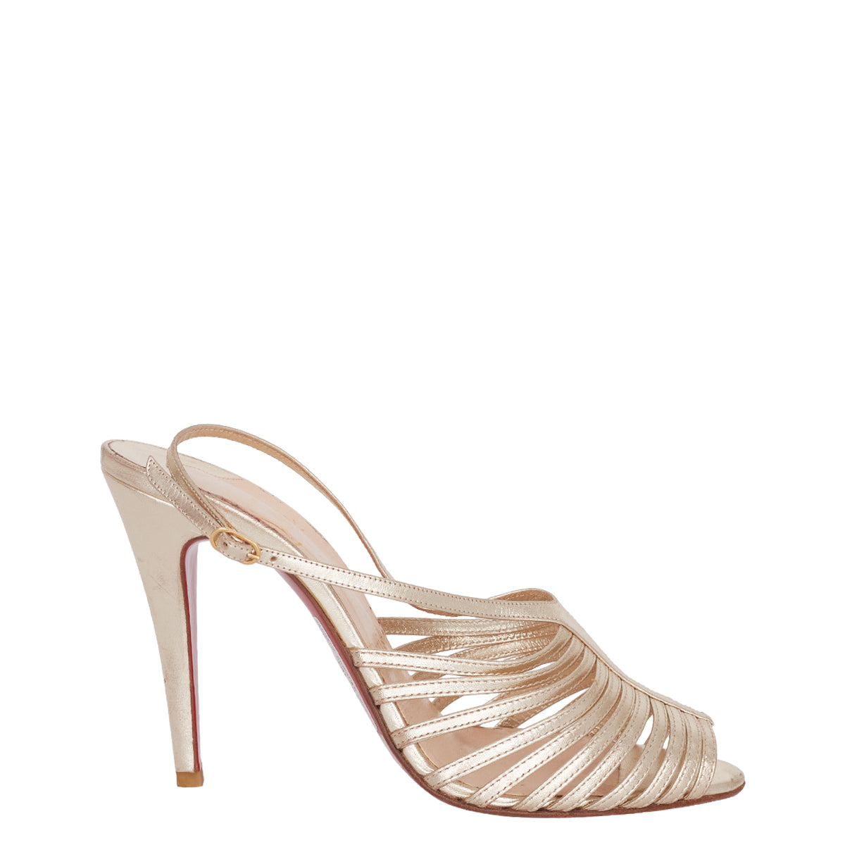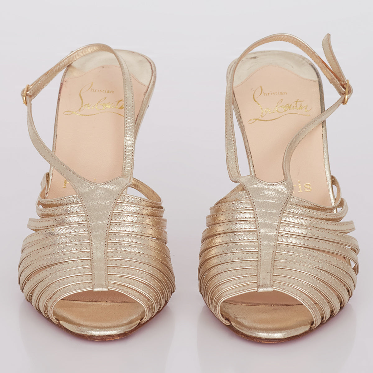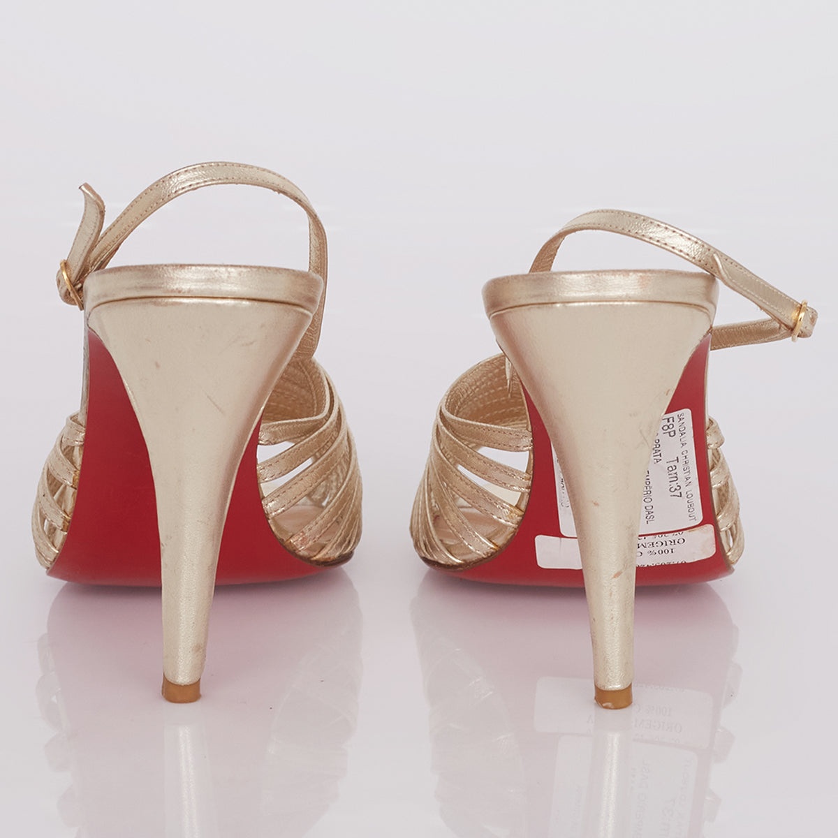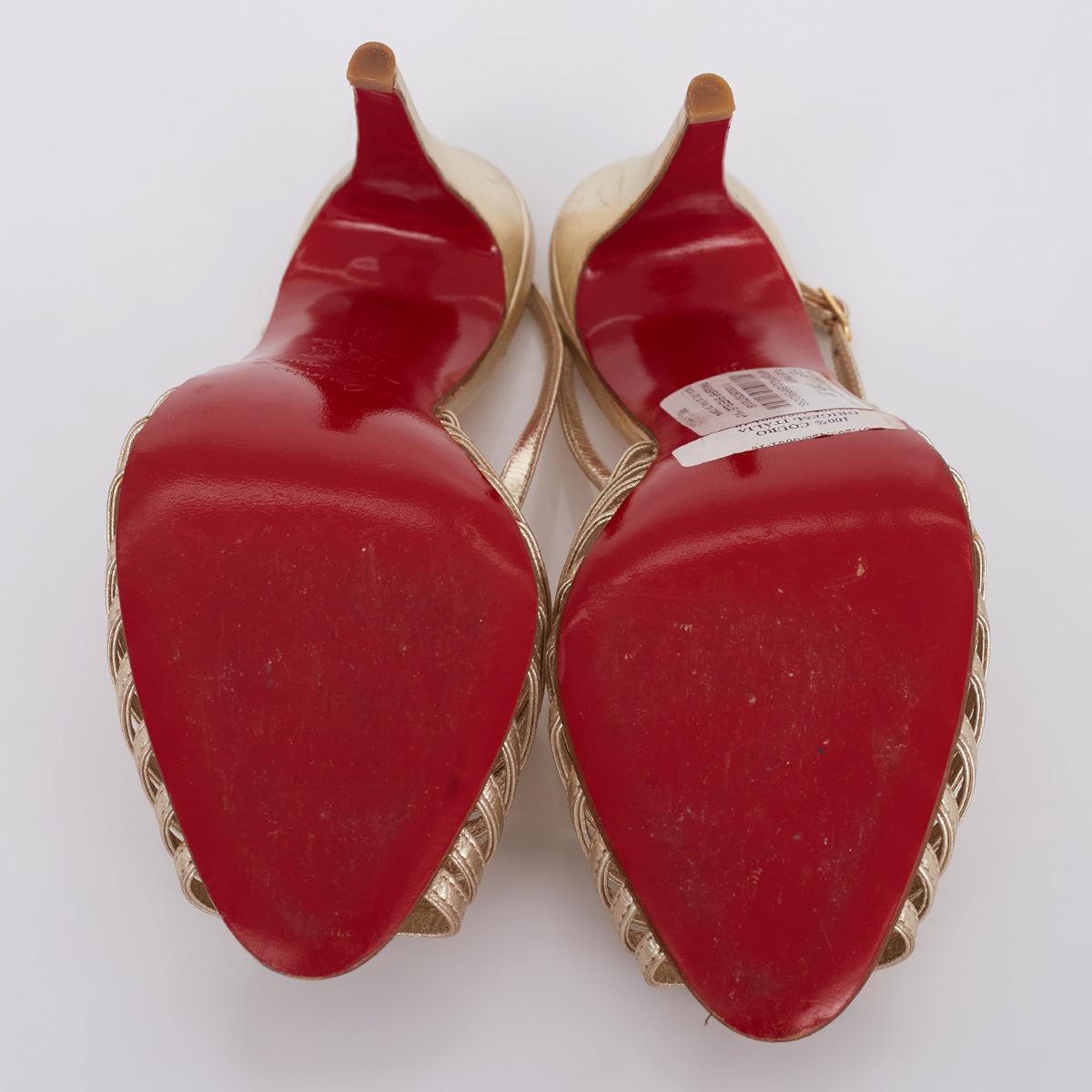 Detalhes: Sapato Christian Louboutin confeccionada em couro na cor dourado. Modelo possui salto alto fino e bico arredondado. Contém tiras trançadas no peito do pé, e abertura na região dos dedos. Fechamento em fivela.
