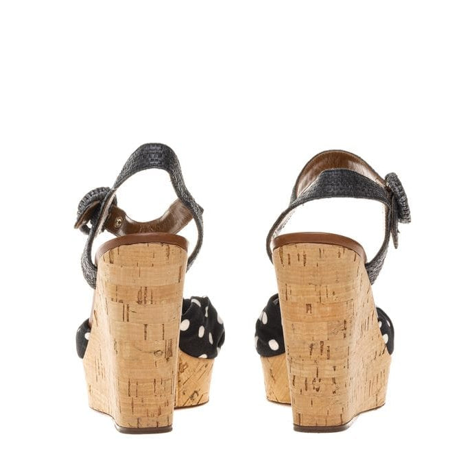 Detalhes: Confeccionado em tecido preto com bolinhas branco, fecho por tiras de palha com fivela ajustável e salto anabela cortiça. A peça se encontra em ótimo estado, com levíssimas marcas de uso solas.