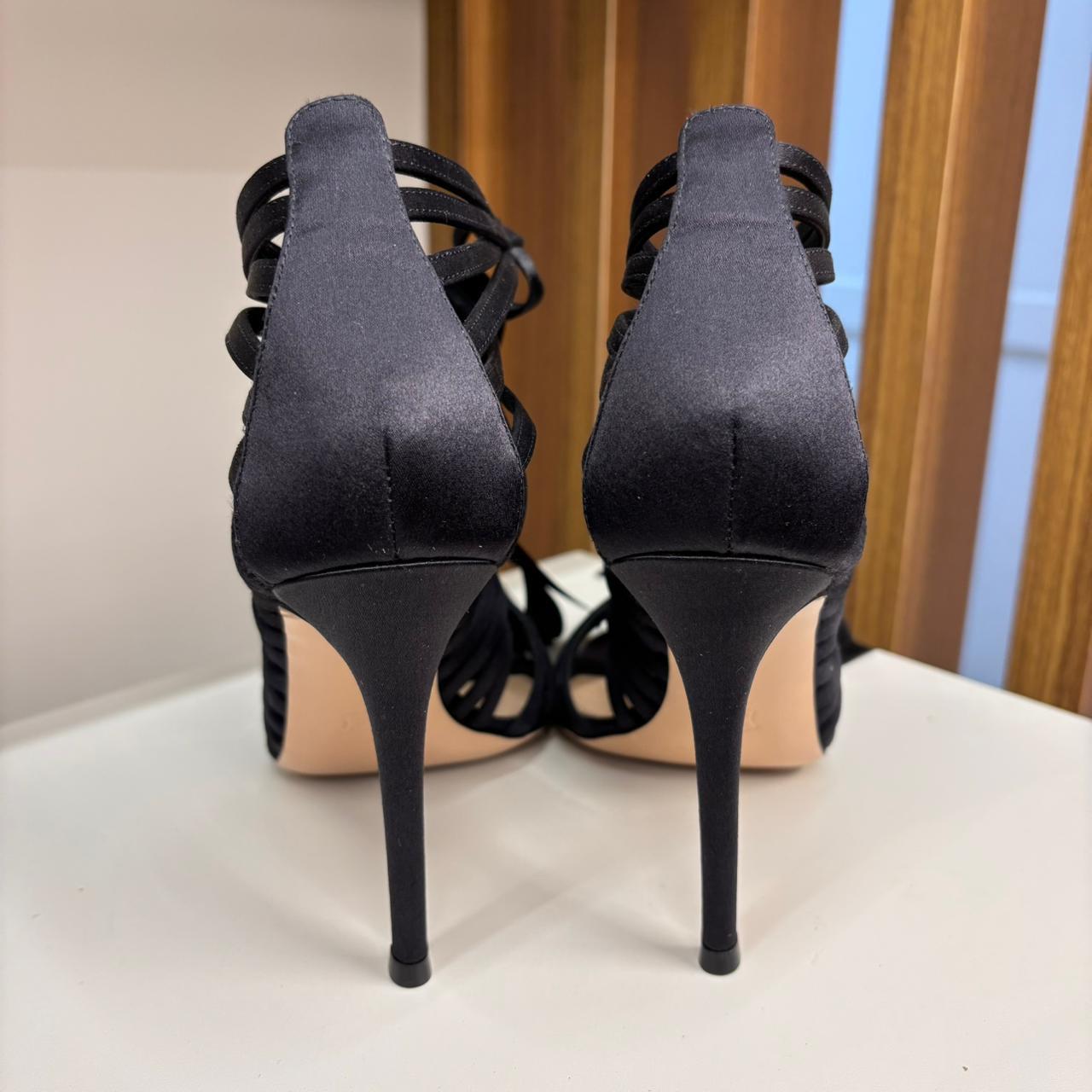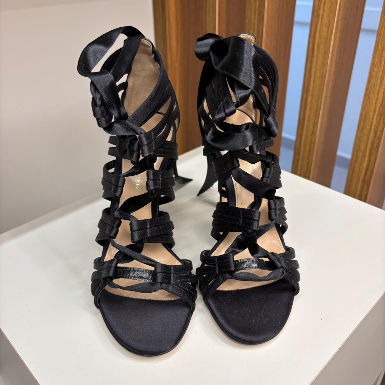 Detalhes: Sandália de cetim de tiras com amarração (Strappy Lace-Up Satin Sandal). Confeccionada em cetim (tecido) com forro e sola de couro. Apresenta múltiplas tiras finas que se cruzam e se amarram no tornozelo, além de salto agulha.