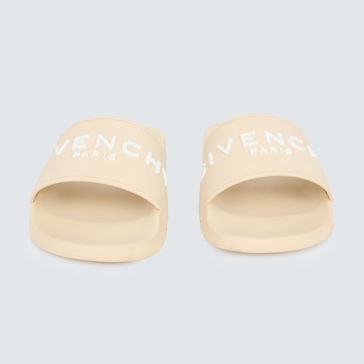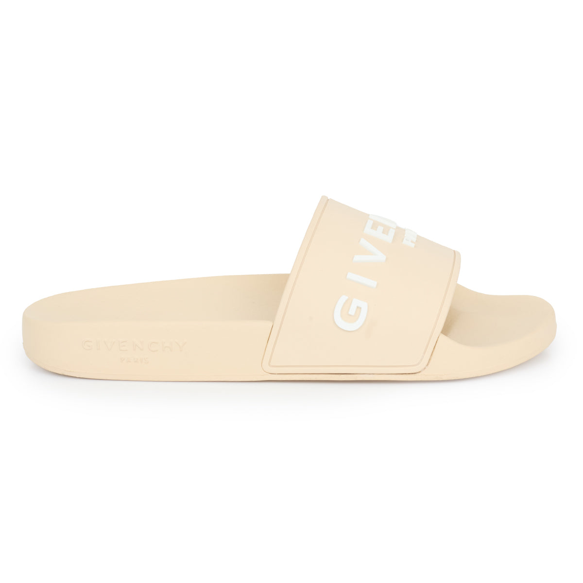 Detalhes: Sandália slide creme, estampa frontal de logo, modelagem slip-on, padronagem Givenchy Paris clássica e solado de borracha.