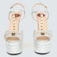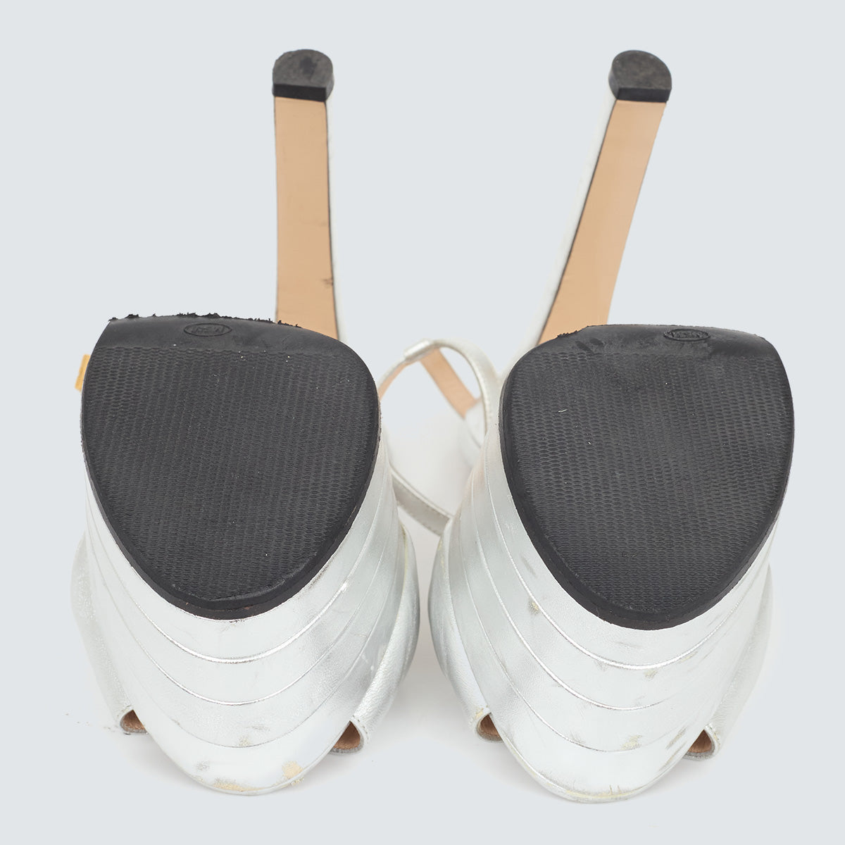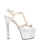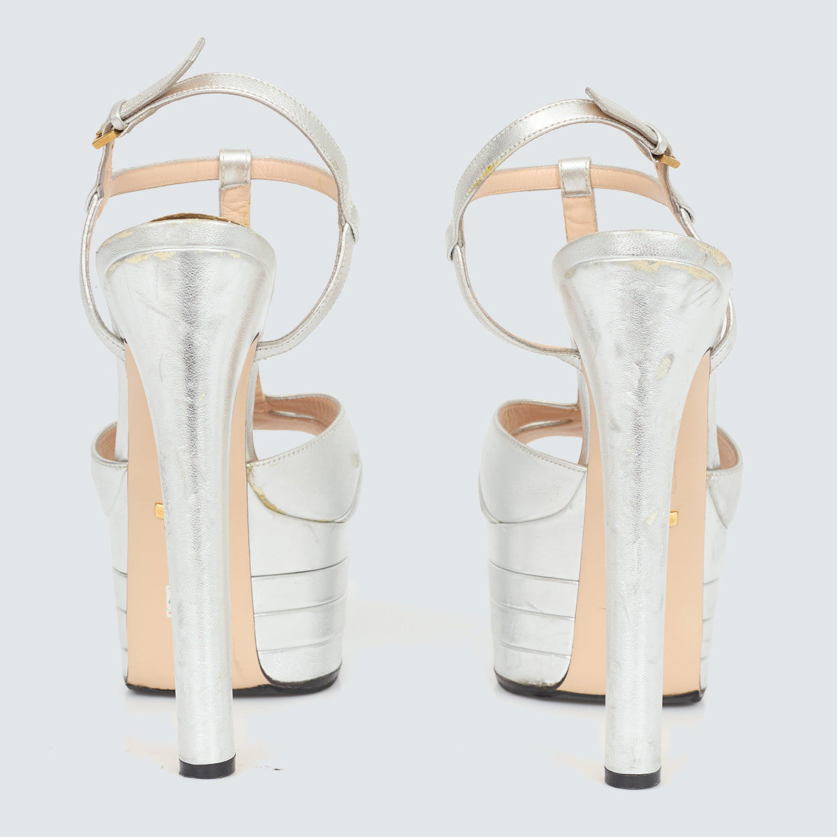 Detalhes: Sandália Gucci, confeccionada em couro na cor prateado. O modelo possui salto alto, plataforma, detalhes em spike, detalhe de tigre na tira, e fecho em fivela no calcanhar.