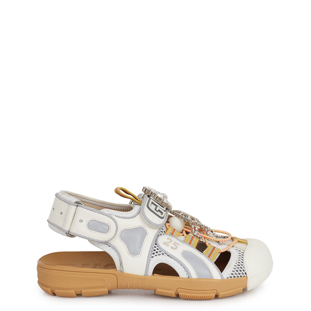 Detalhes: Sandália Gucci Tinsel Mesh Crysta confeccionada em couro. Modelo possui aberturas laterais, aplicação de strass e elástico colorido.