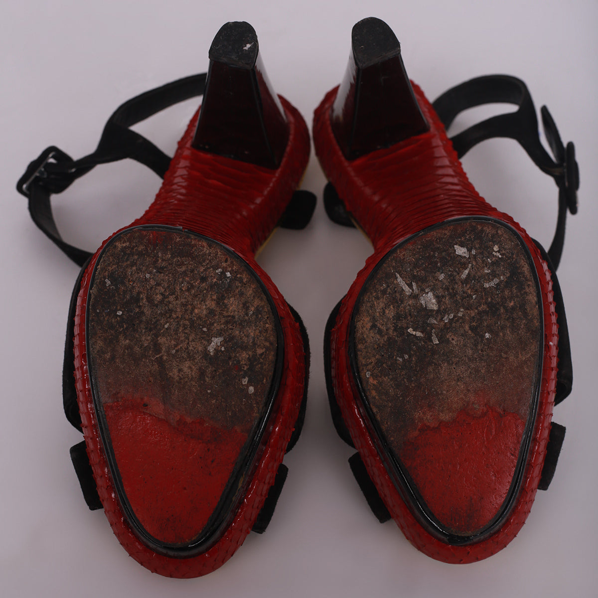 Detalhe: Sandália Louboutin preta com vermelho. Possui plataforma e salto alto grosso.