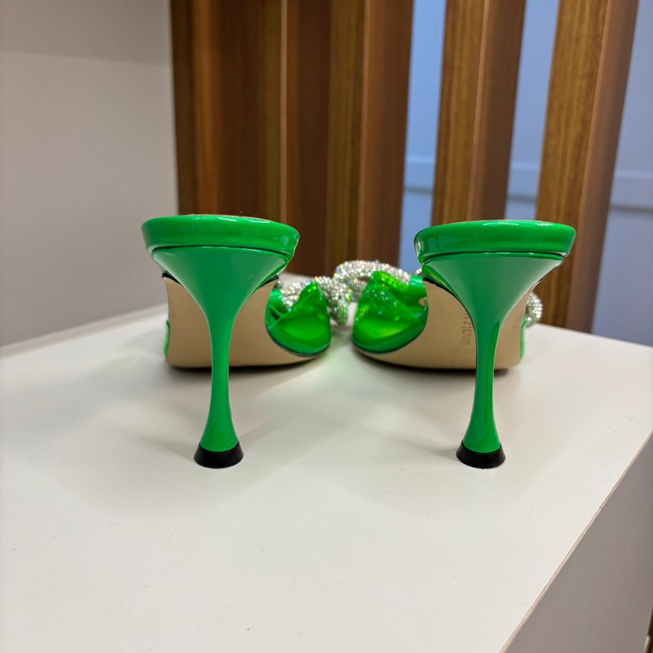 Detalhes: Possuem um salto agulha e um bico quadrado. A tira transparente sobre o peito do pé é adornada com o icônico laço duplo da marca, cravejado de cristais. A base e o salto são em um acabamento verde brilhante.