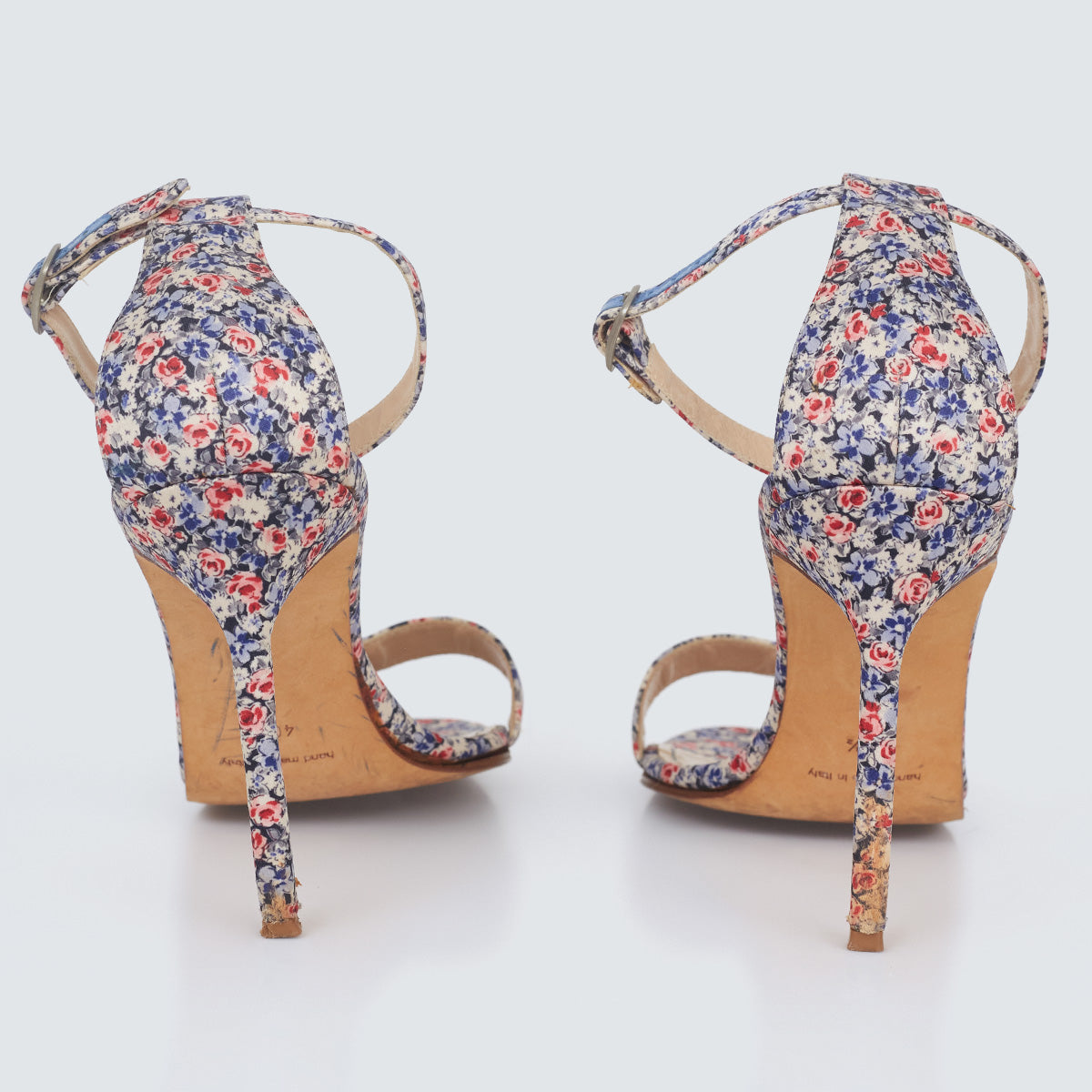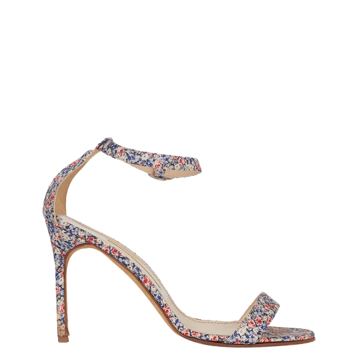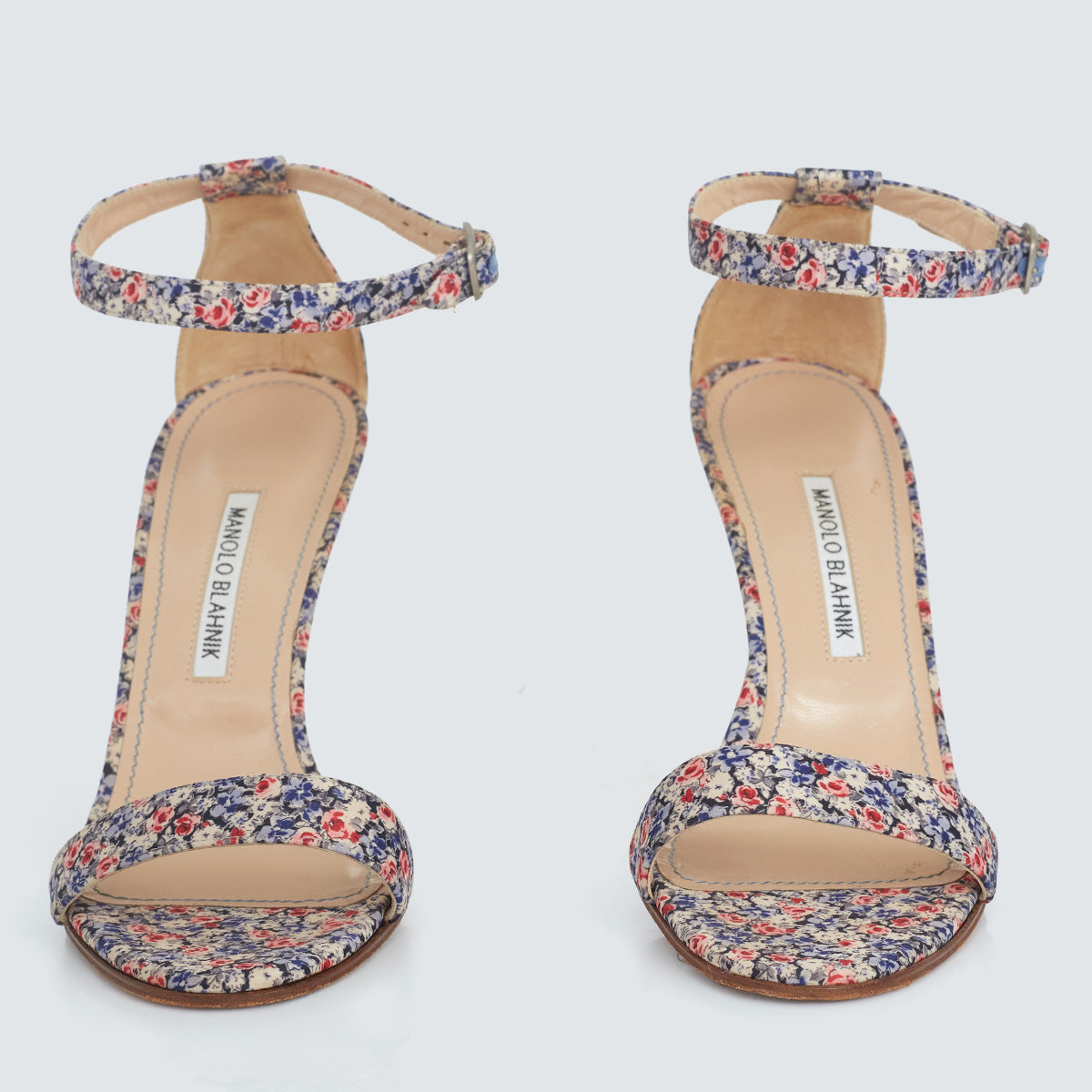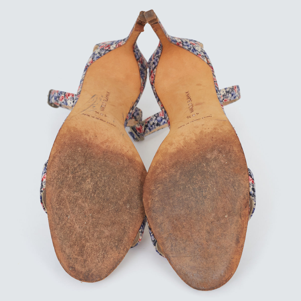 Detalhes: Sandália Manolo Blahnik confeccionada em couro com acabamento em tecido florido. Modelo possui salto alto fino, duas tiras, parte posterior fechada e fechamento por fivela.