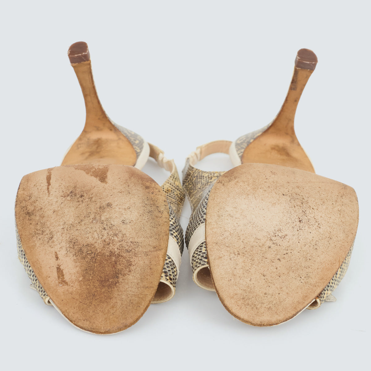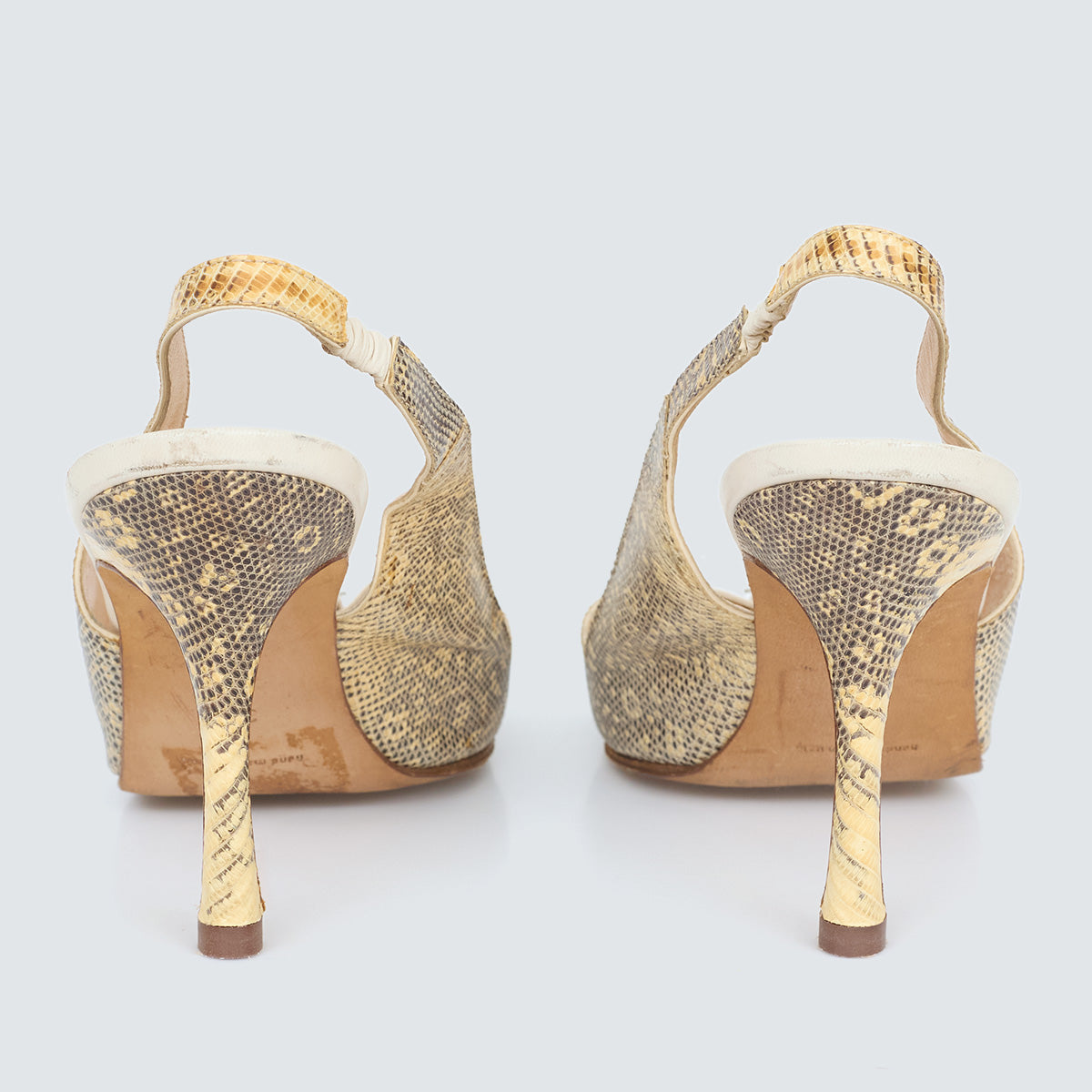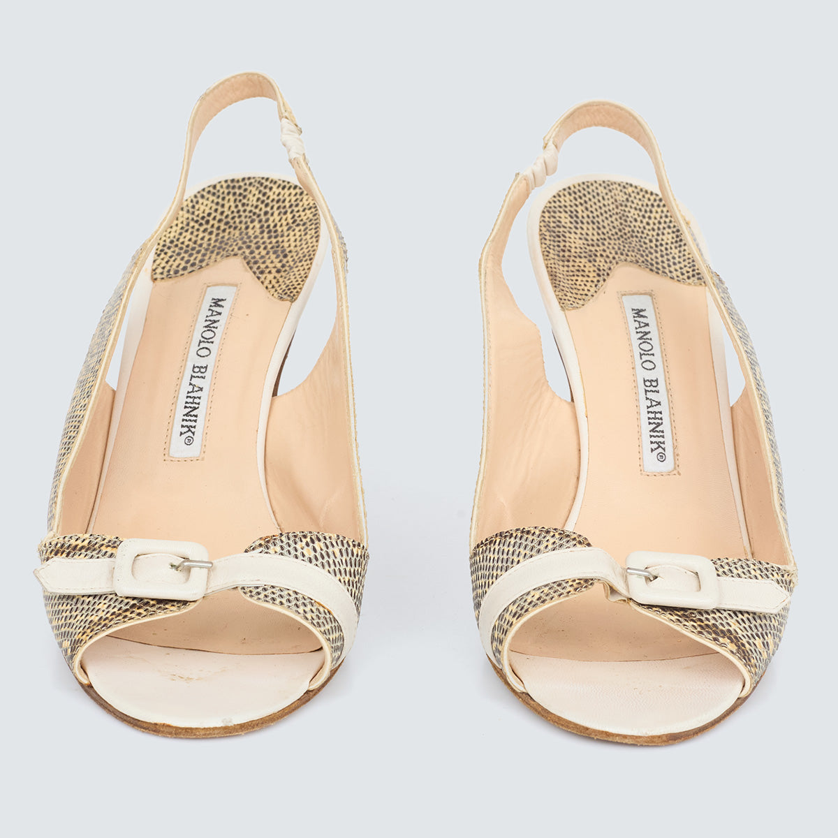 Detalhes: sandália Manolo Blahnik confeccionada em couro. O modelo apresenta couro texturizado em preto e bege. detalhe de fivela e modelo slip on com ajuste do pé em elástico.
