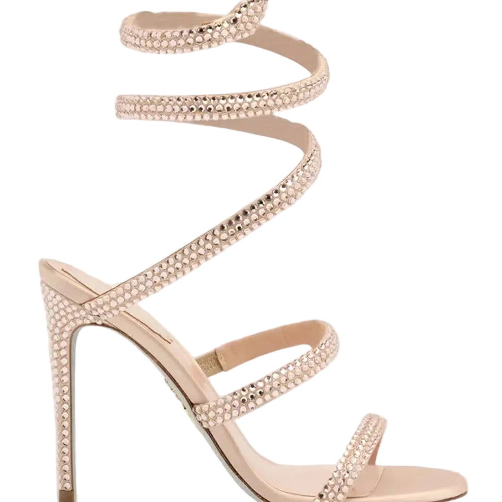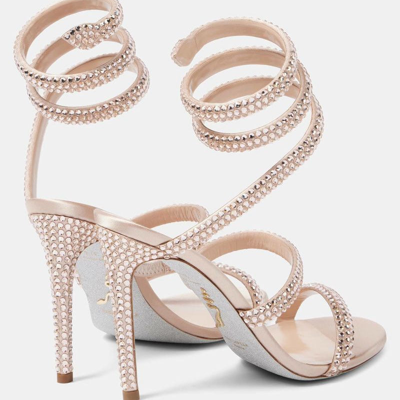 Detalhes: Sandália Rene Caovilla, na cor rosa. Confeccionado em Tecido acetinado e couro. Possui bico arredondado, tiras de cristal em forma de serpente que se enrola elegantemente no tornozelo e sola com acabamento em glitter prateado.