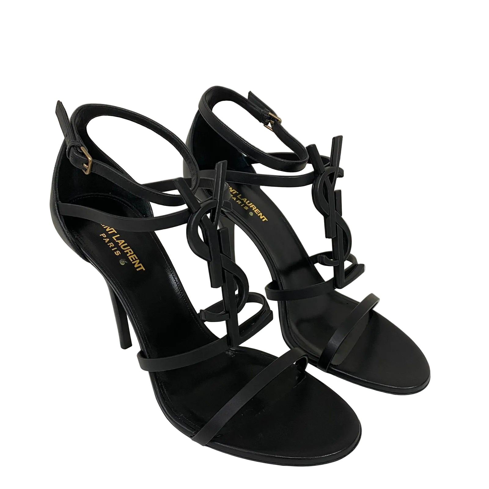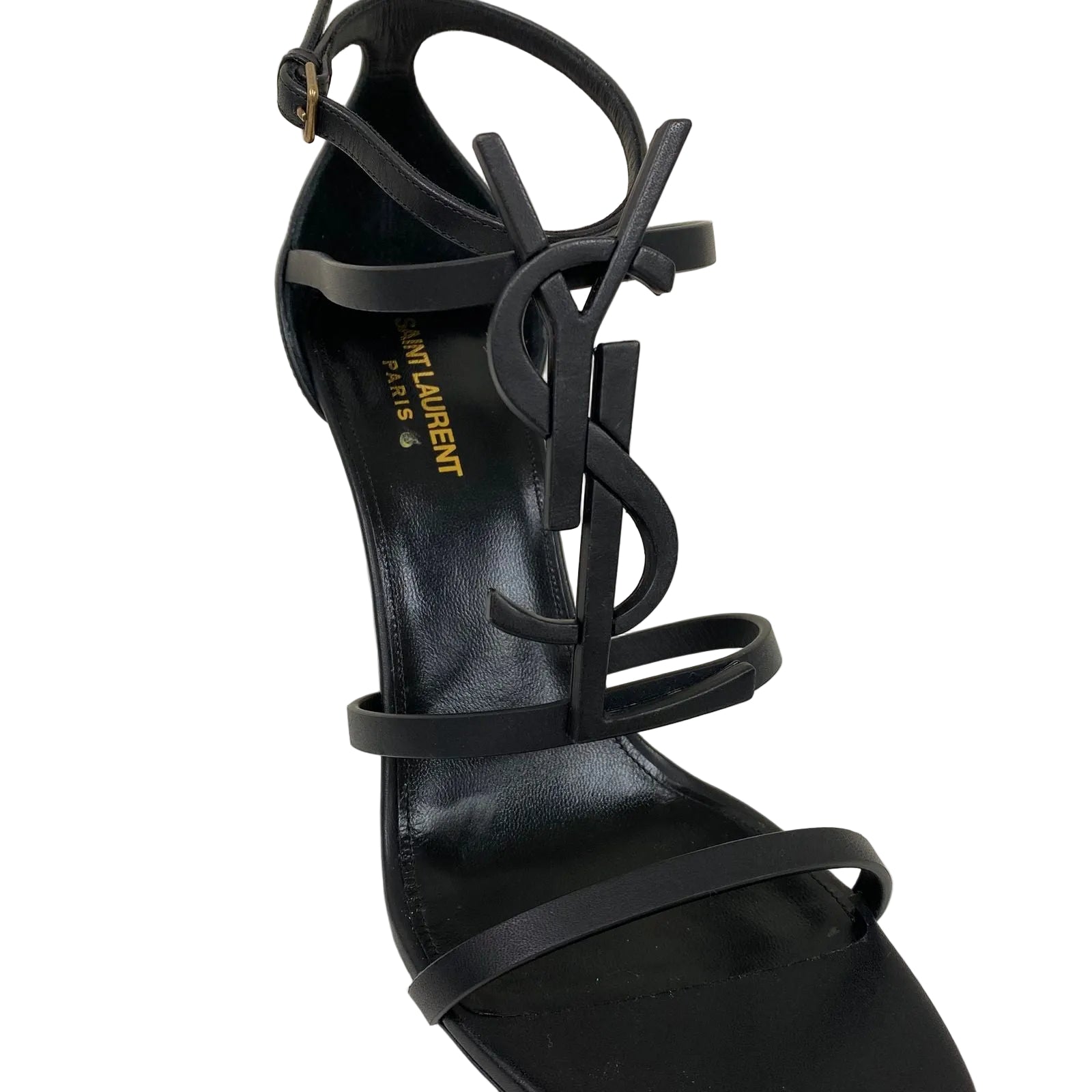 Detalhes: Sandália Saint Laurent Cassandra confeccionada em couro e borracha, possui bico arredondado, salto alto e fino, tiras vazadas e detalhe de logo fosco YSL no peito do pé. Fechamento lateral por fivelas de ajuste.