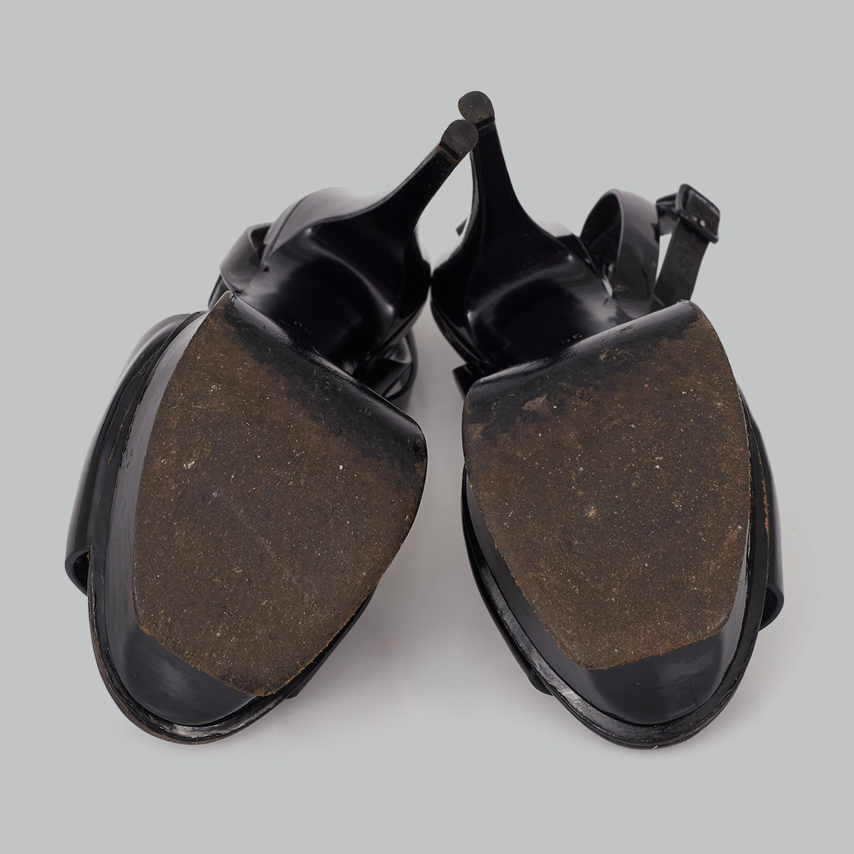 Detalhes: Sandália Saint Laurent confeccionada em couro envernizado na cor preta. Modelo possui salto alto fino, tira frontal, peep toe, tira no tornozelo e plataforma meia pata. Fechamento em fivela de ajuste. *Acompanha dustbag da marca*