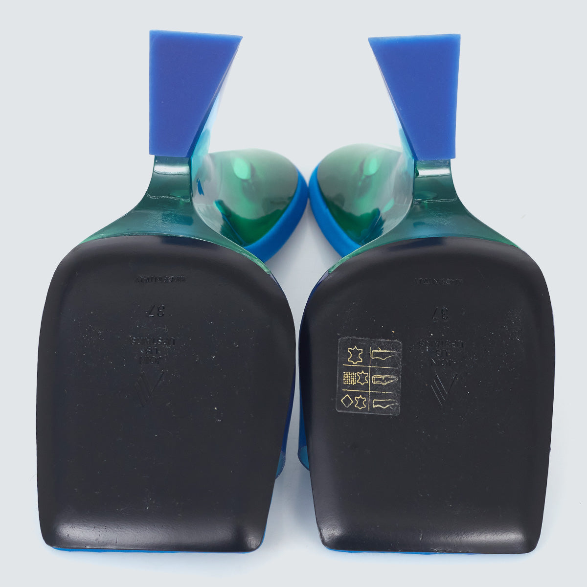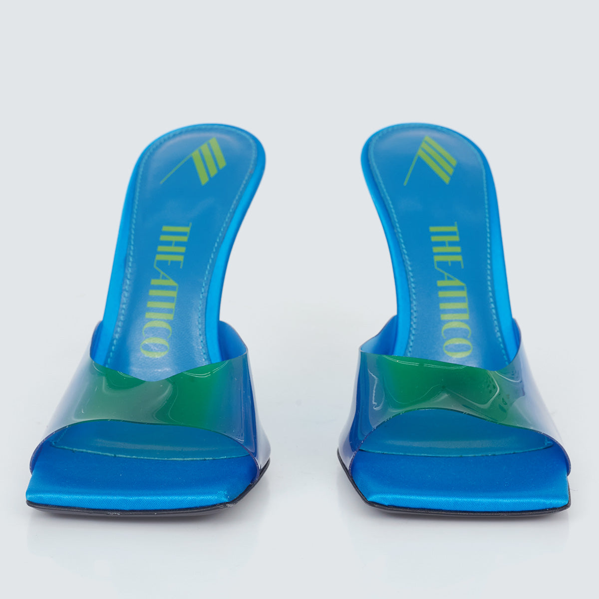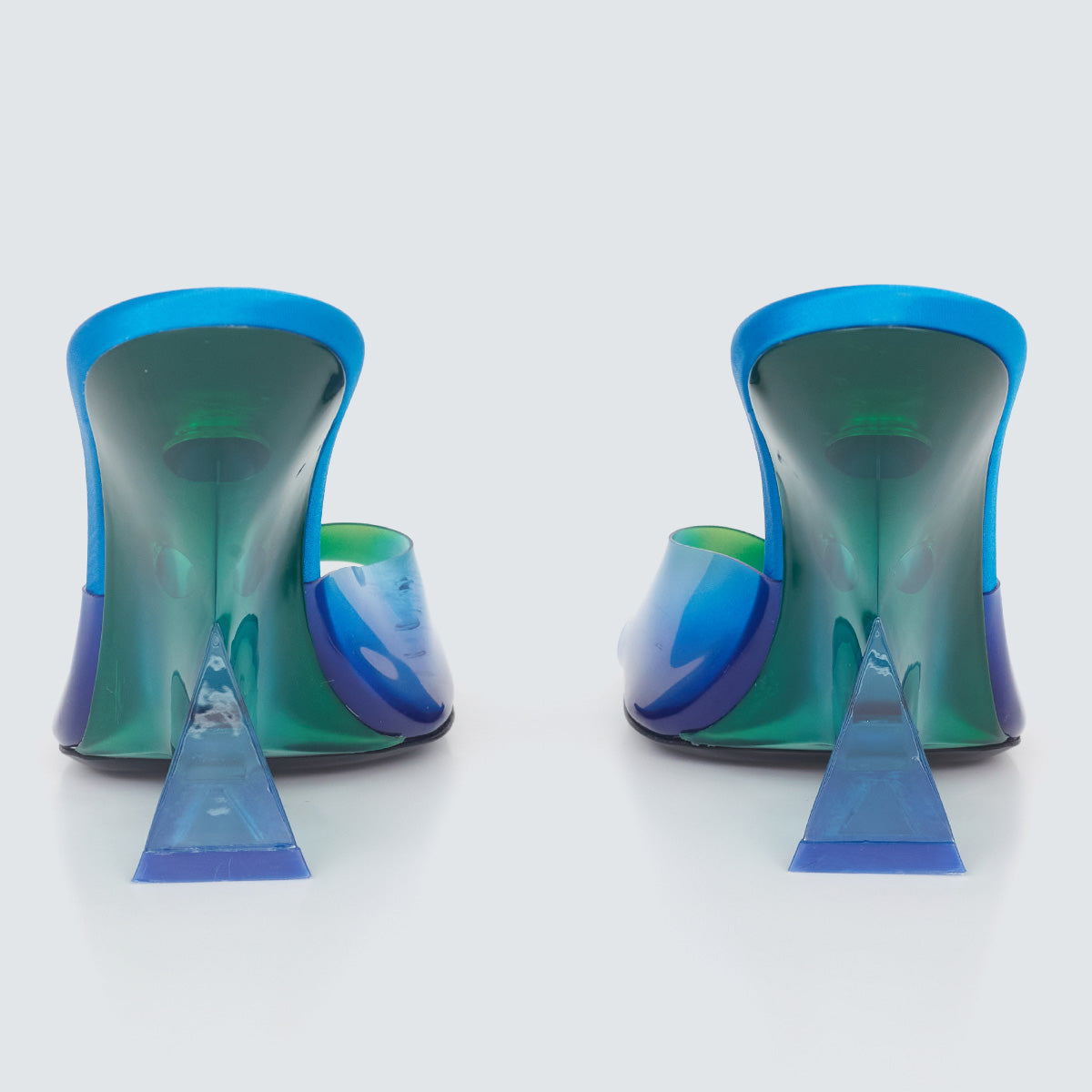 Detalhes: Sandália The Attico confeccionada em couro e plástico na cor azul esverdeado. Modelo possui tira grossa, bico quadrado, abertura para os dedos, e salto baixo em formato de pirâmide.