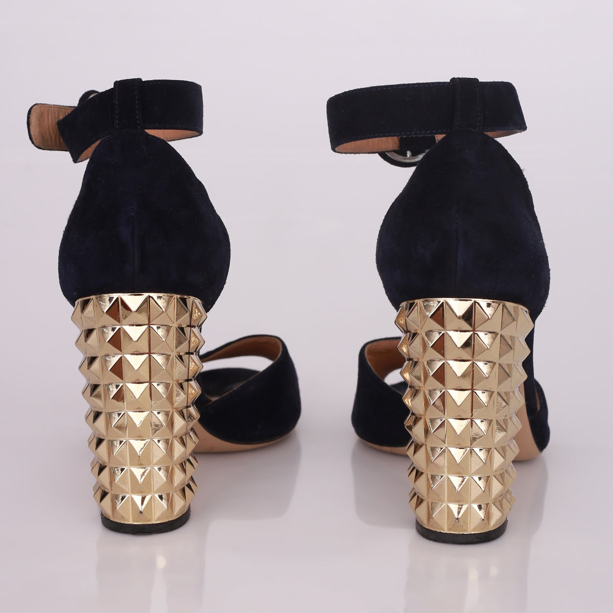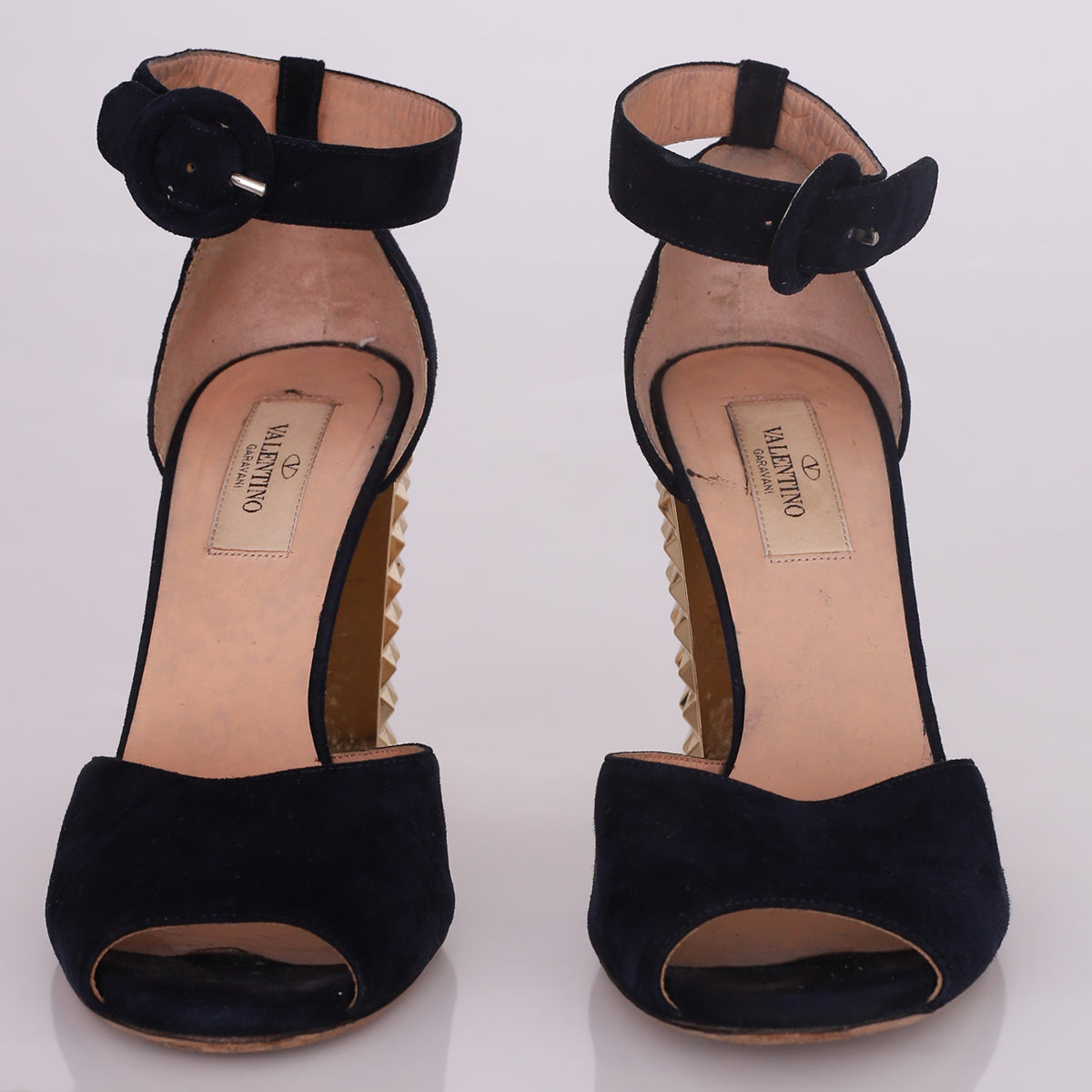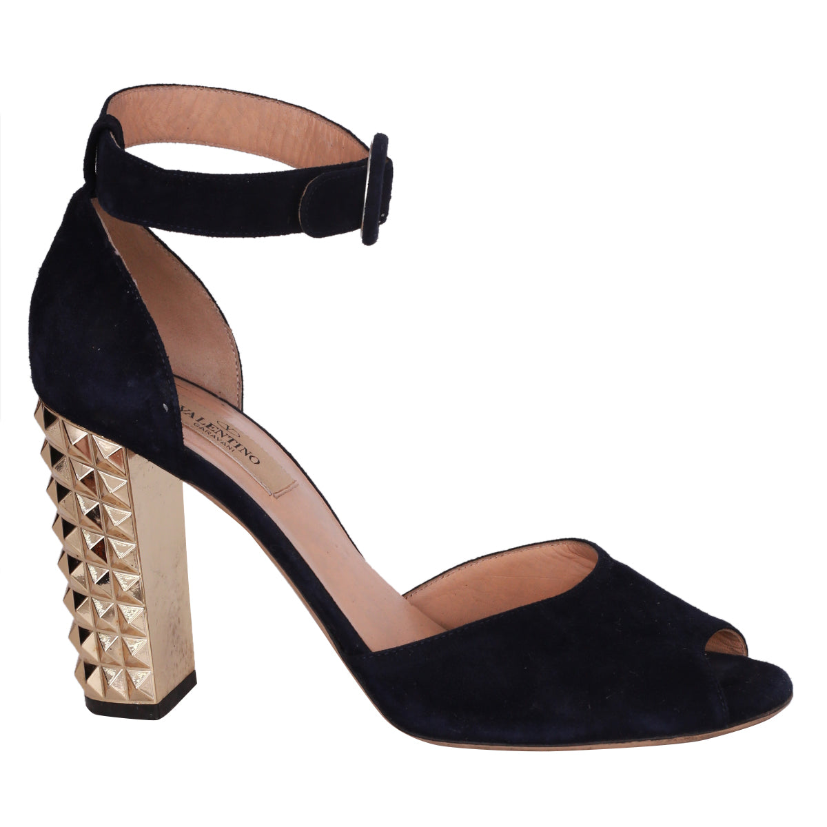 Detalhes: Sandália Valentino confeccionada em camurça na cor azul marinho. O modelo possui bico redondo, peep toe, salto alto grosso, posterior fechado, tira no tornozelo e salto em tachas douradas. Fechamento por fivela no tornozelo.
