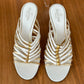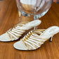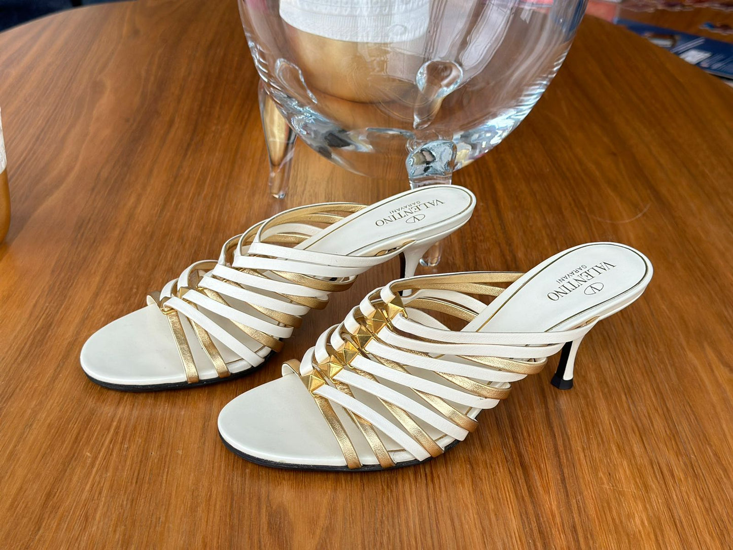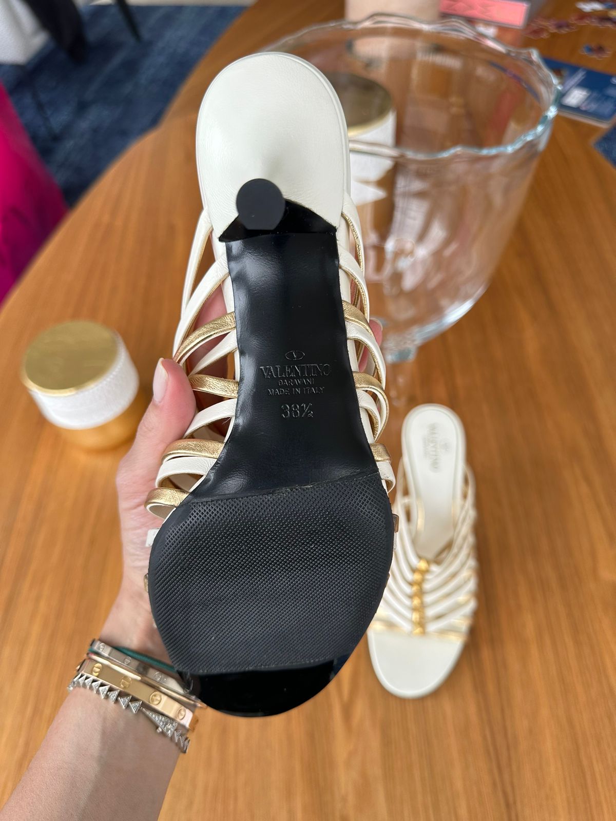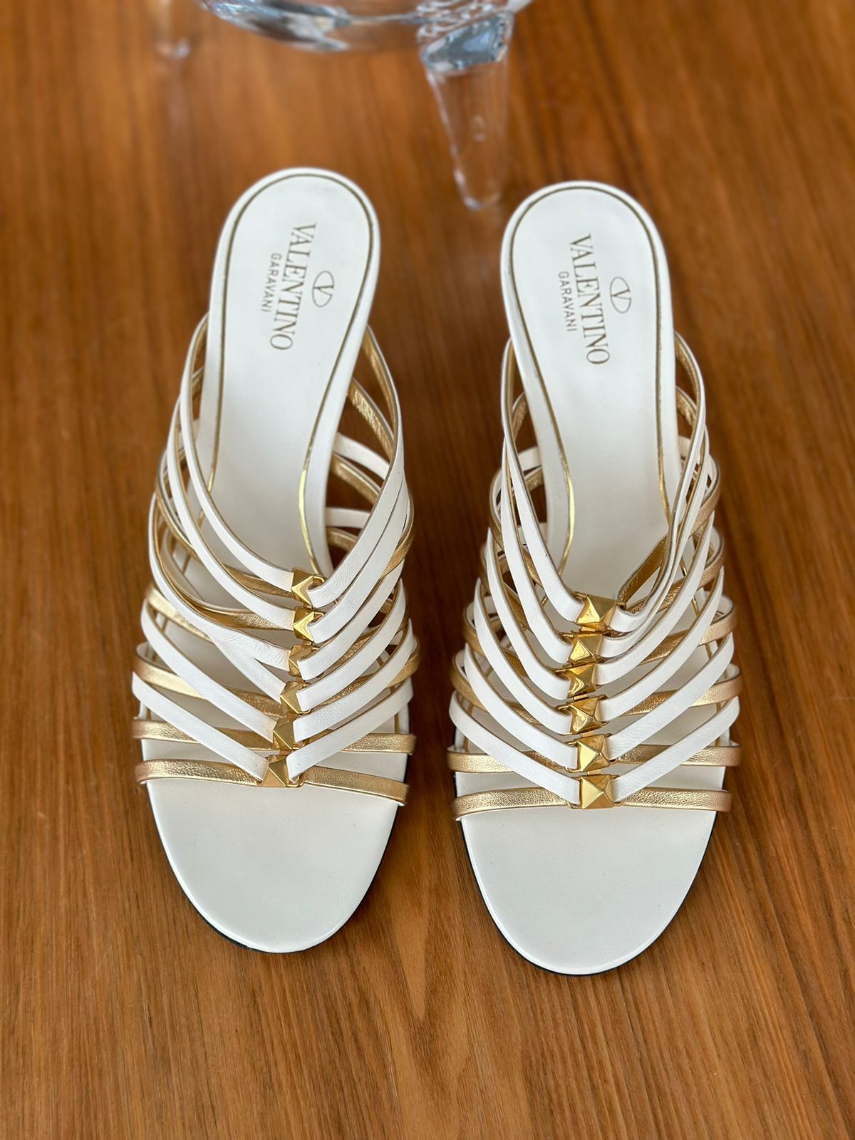 Detalhes: Sandália Valentino confeccionada em couro branco com detalhes em studs dourados. Modelo possuiu salto baixo fino, tiras no peito do pé branca e dourada e bico arredondado.