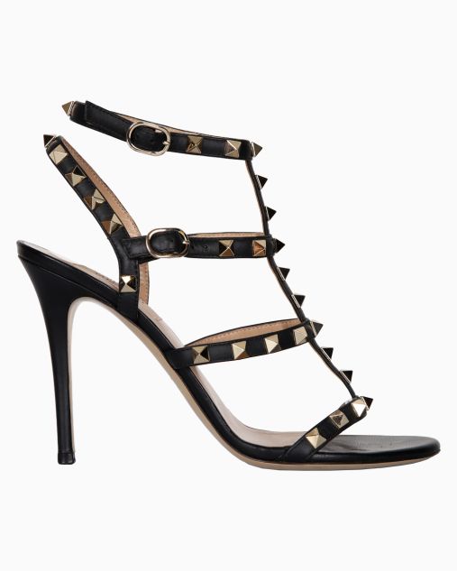 Detalhes: Sandália de couro na cor preta, estilo gladiador/caged, com múltiplas tiras. Aplicações de rockstuds (tachas piramidais) metálicas na cor dourada, inspiradas na arquitetura romana, Tiras com fivelas ajustáveis no tornozelo.