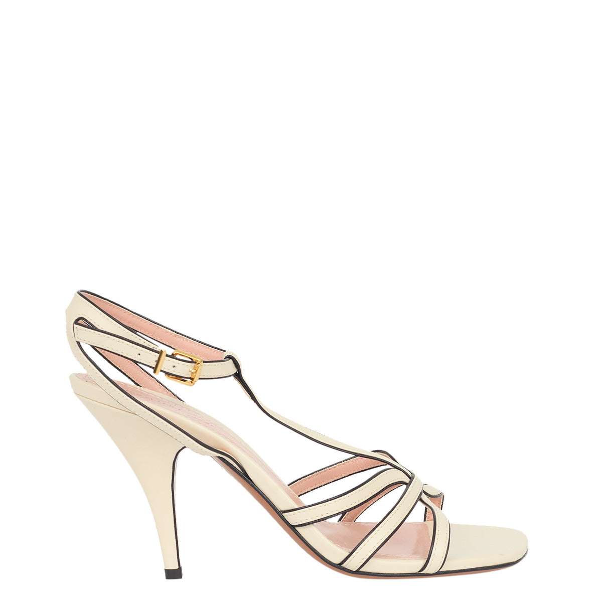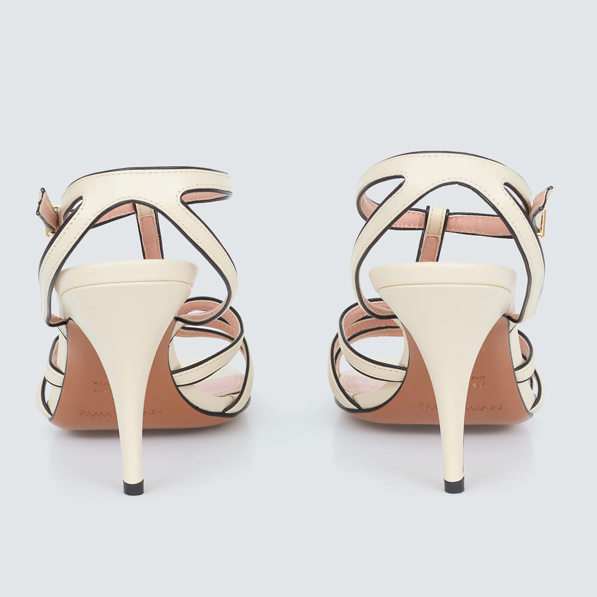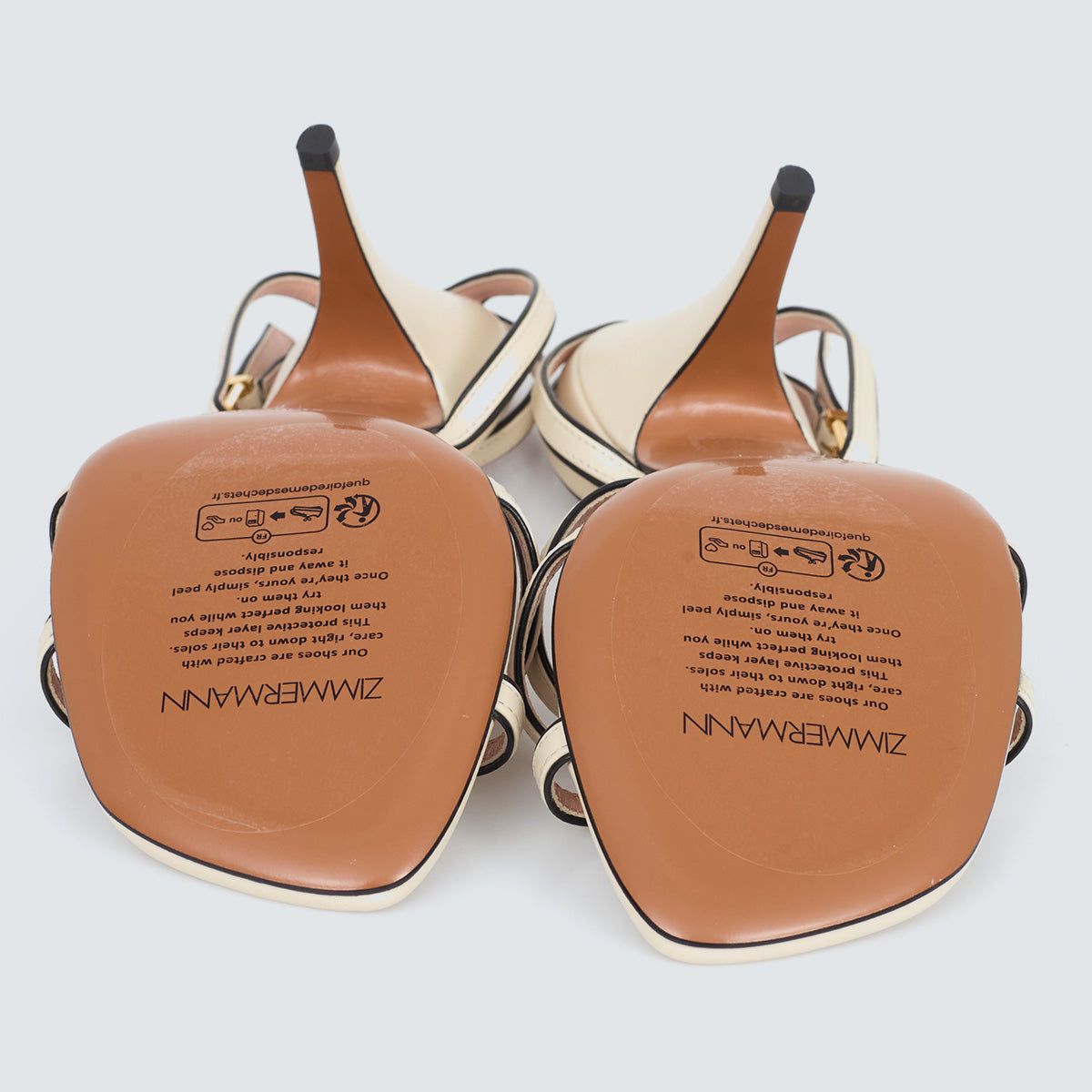 Detalhes: Sandália Zimmerman confeccionada em couro na cor off-white. Modelo possui tiras no peito do pé, detalhes de contorno em preto e fechamento por fivela no tornozelo.