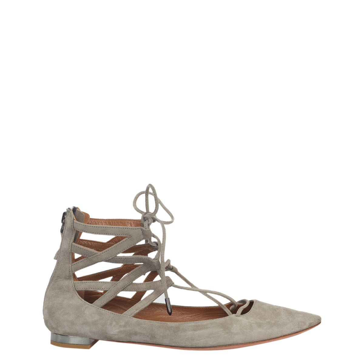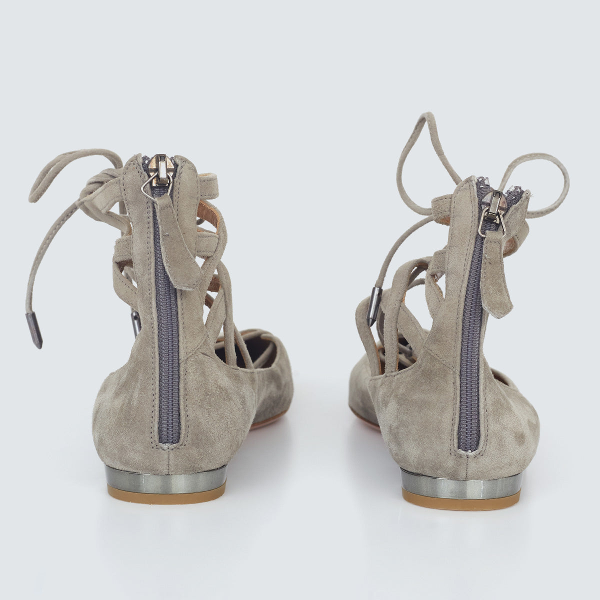 Detalhes: Sapatilha Aquazzura Cinza. Modelo possui bico fino, e detalhe em tiras transpassadas. Parte posterior com fechamento em zíper.