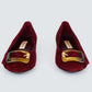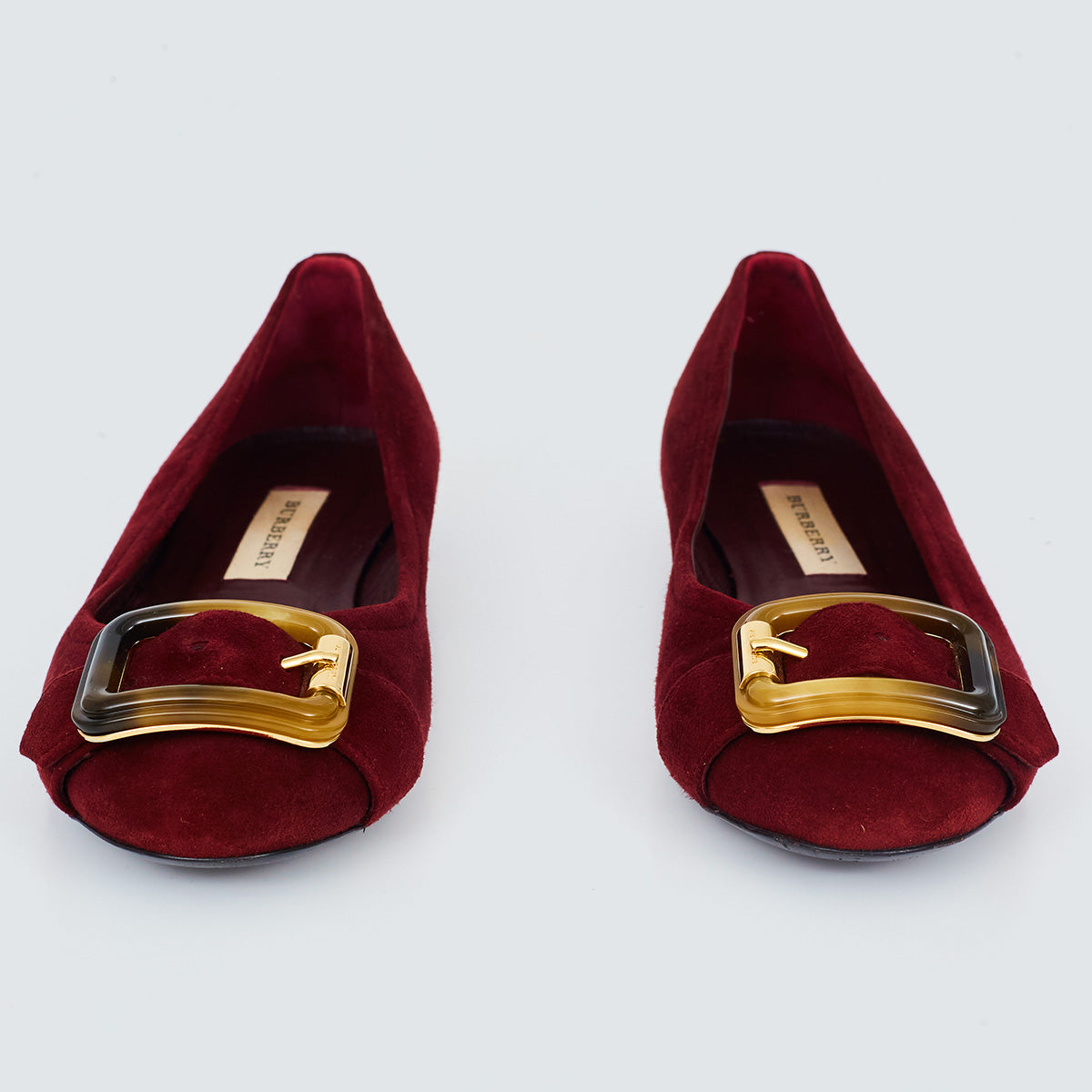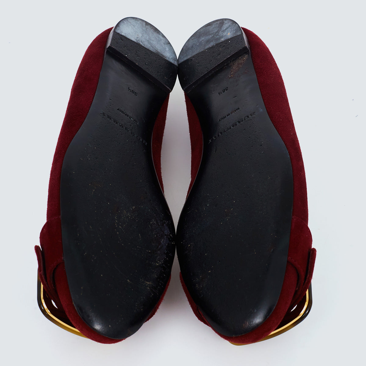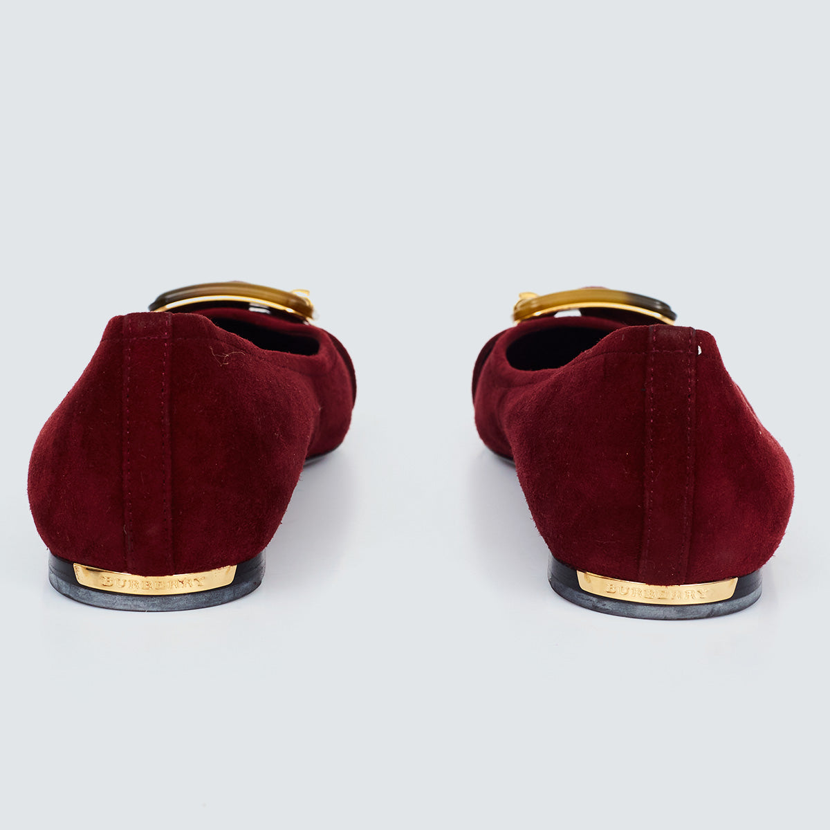 Detalhe: Sapatilha confeccionada em suede na cor vinho, o modelo apresenta um fivela quadrada no bico com detalhes dourados.