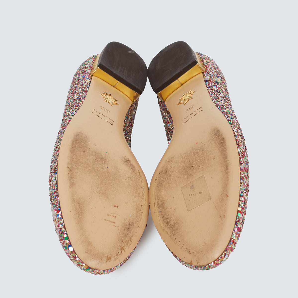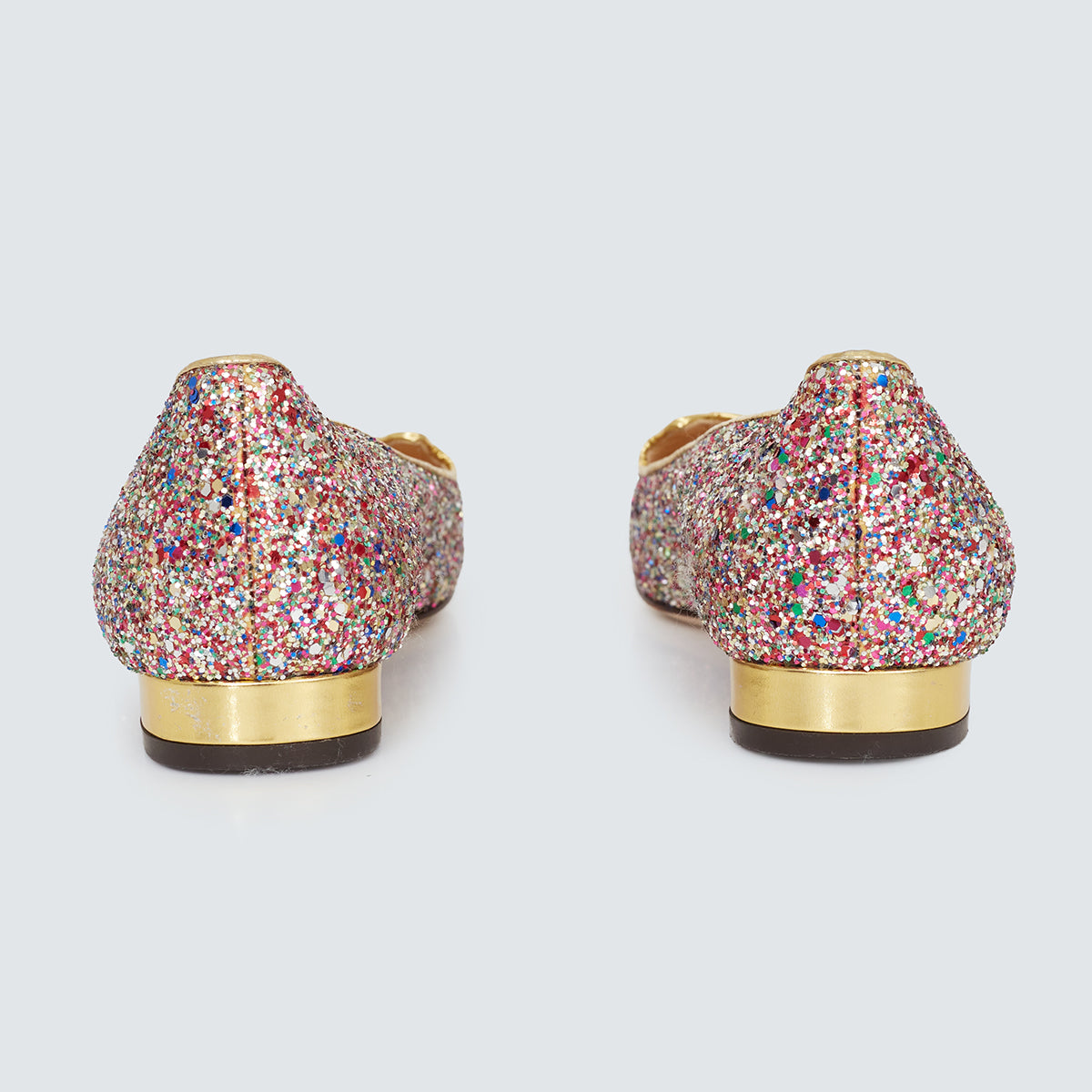 Detalhes: Sapatilha Charlotte Olympia de glitter colorido. Modelo com ponta redonda, saltinho baixo dourado e frontal com representação de gato.