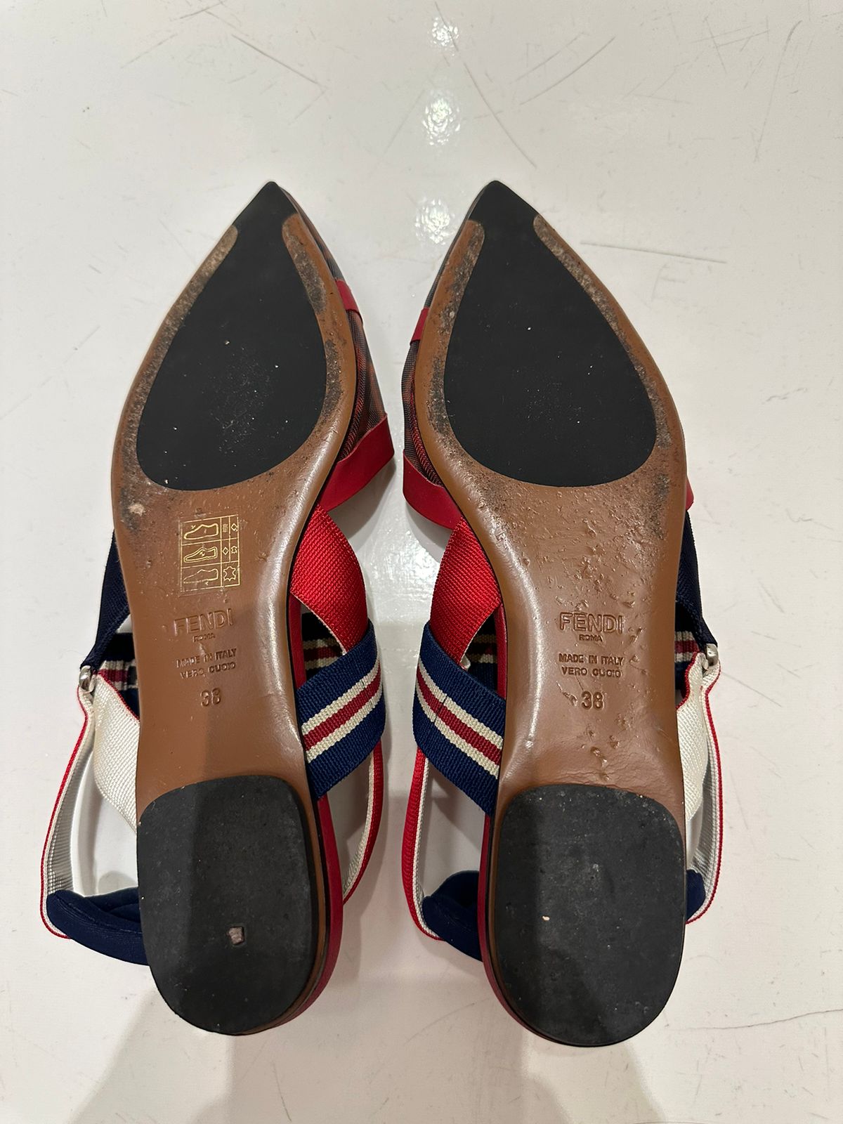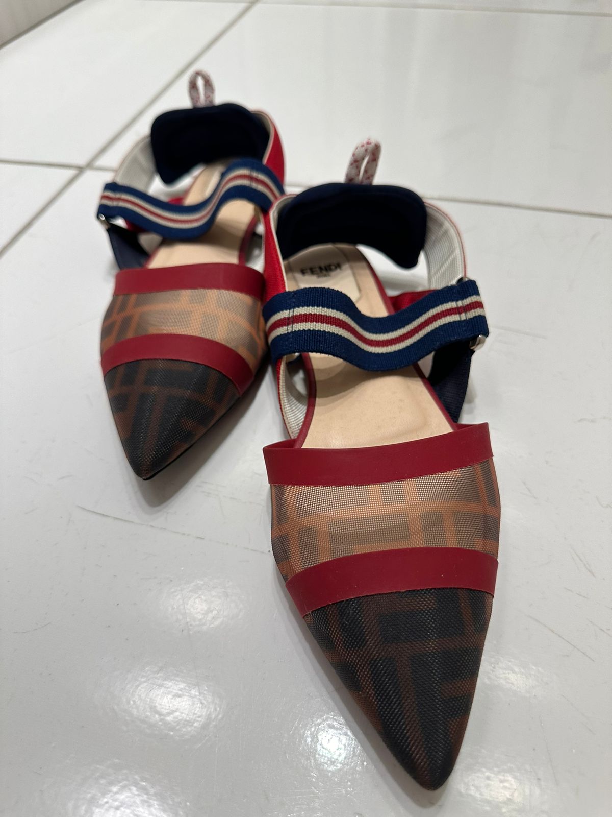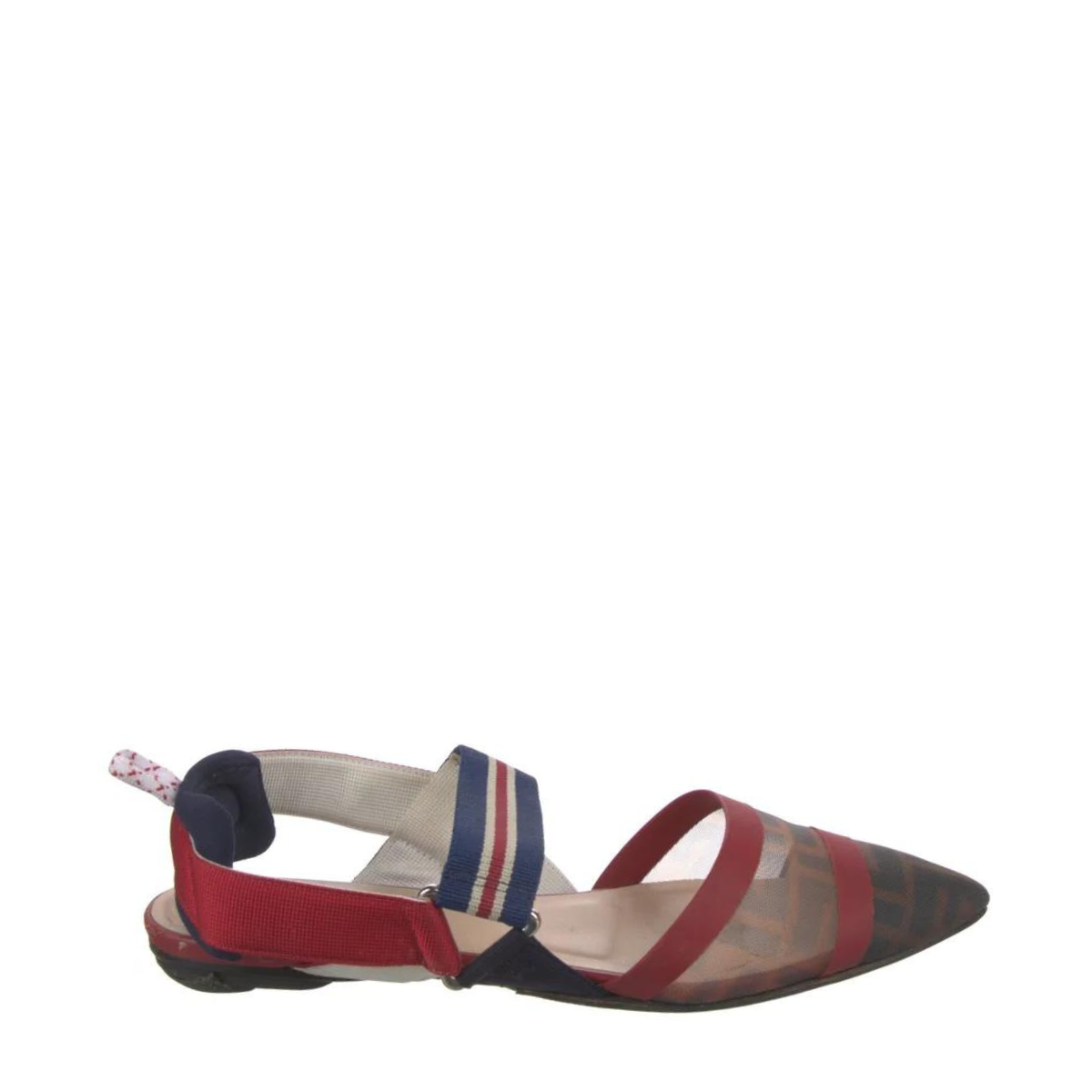 Detalhes: Sapatilha Fendi Slingback confeccionada em tecido de malha e couro. Modelo possui bico fino, tira de gorgorão elástica sobre o peito do pé. Tira de costas acolchoada com detalhe de presilha.