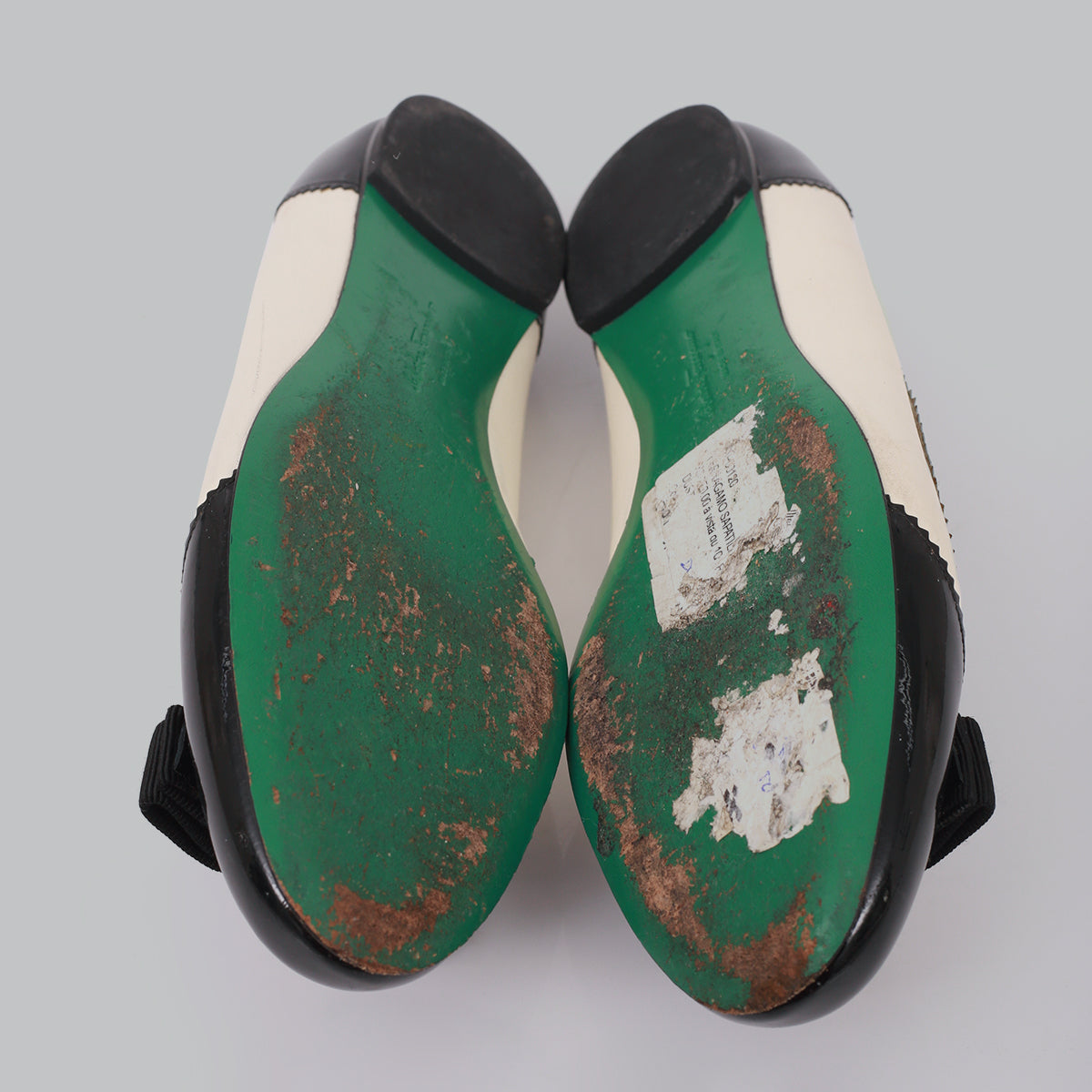 Detalhes: Sapatilha confeccionada em couro na cor off white. Modelo possui bico arredondado na cor preta com laço e placa de logo da marca, detalhe no calcanhar na cor preta e detalhes em verde e azul nas extremidades. *Acompanha dustbag da marca*