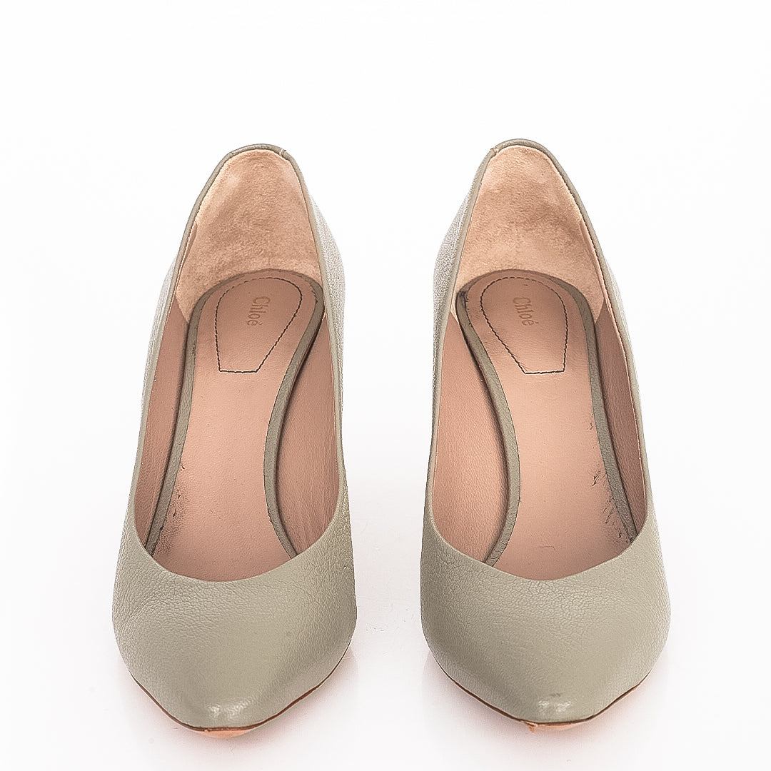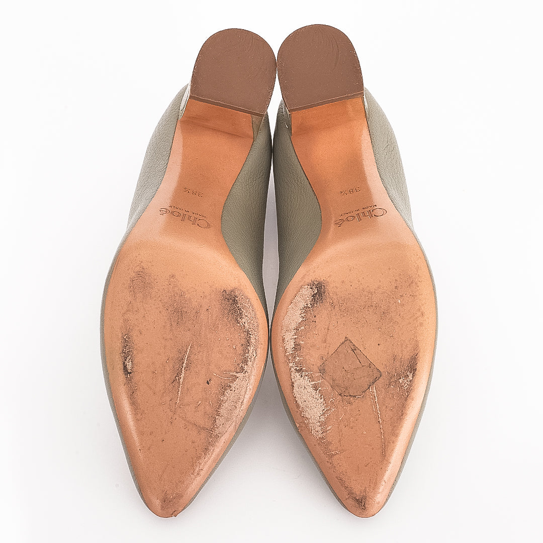 Detalhes: Sapato Chloé confeccionado em couro na cor verde pastel com detalhe em ferragem dourada. Possui bico fino alongado, salto médio grosso e placa em metal dourada aplicada ao salto.