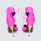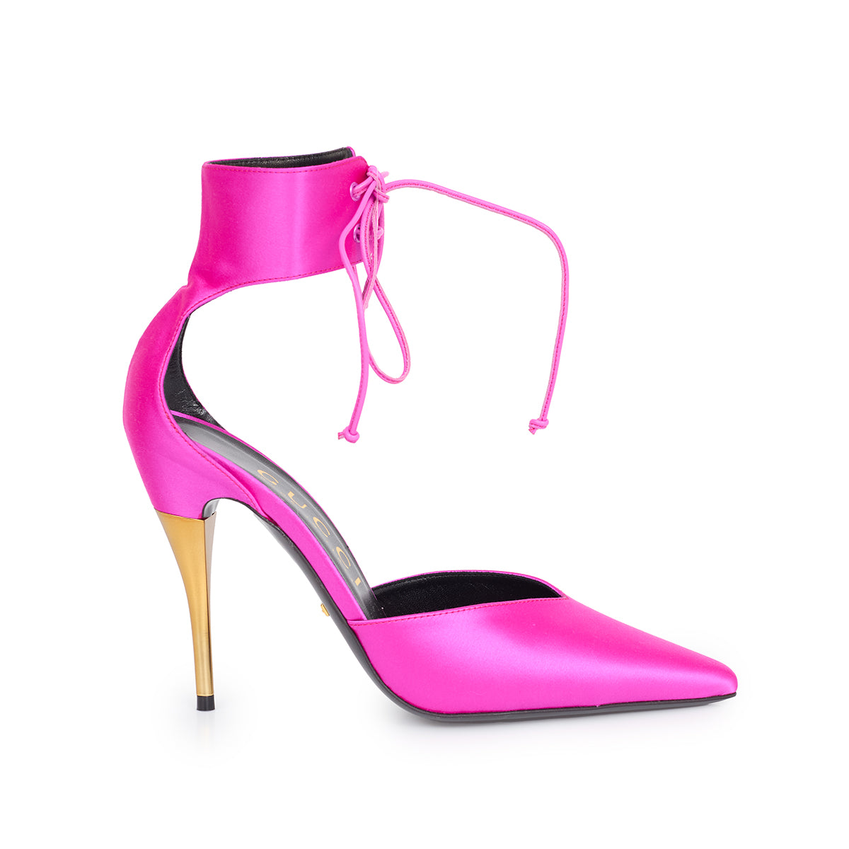 Detalhes: Modelo confeccionado em couro interno e tecido acetinado externo. Conta com bico fino, salto alto fino em metal na cor dourado, fecho em amarração. *Acompanha caixa da Gucci*