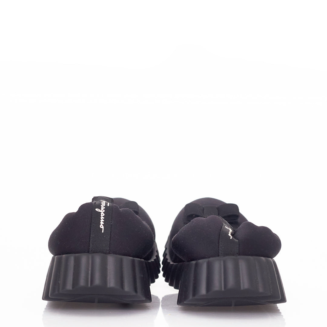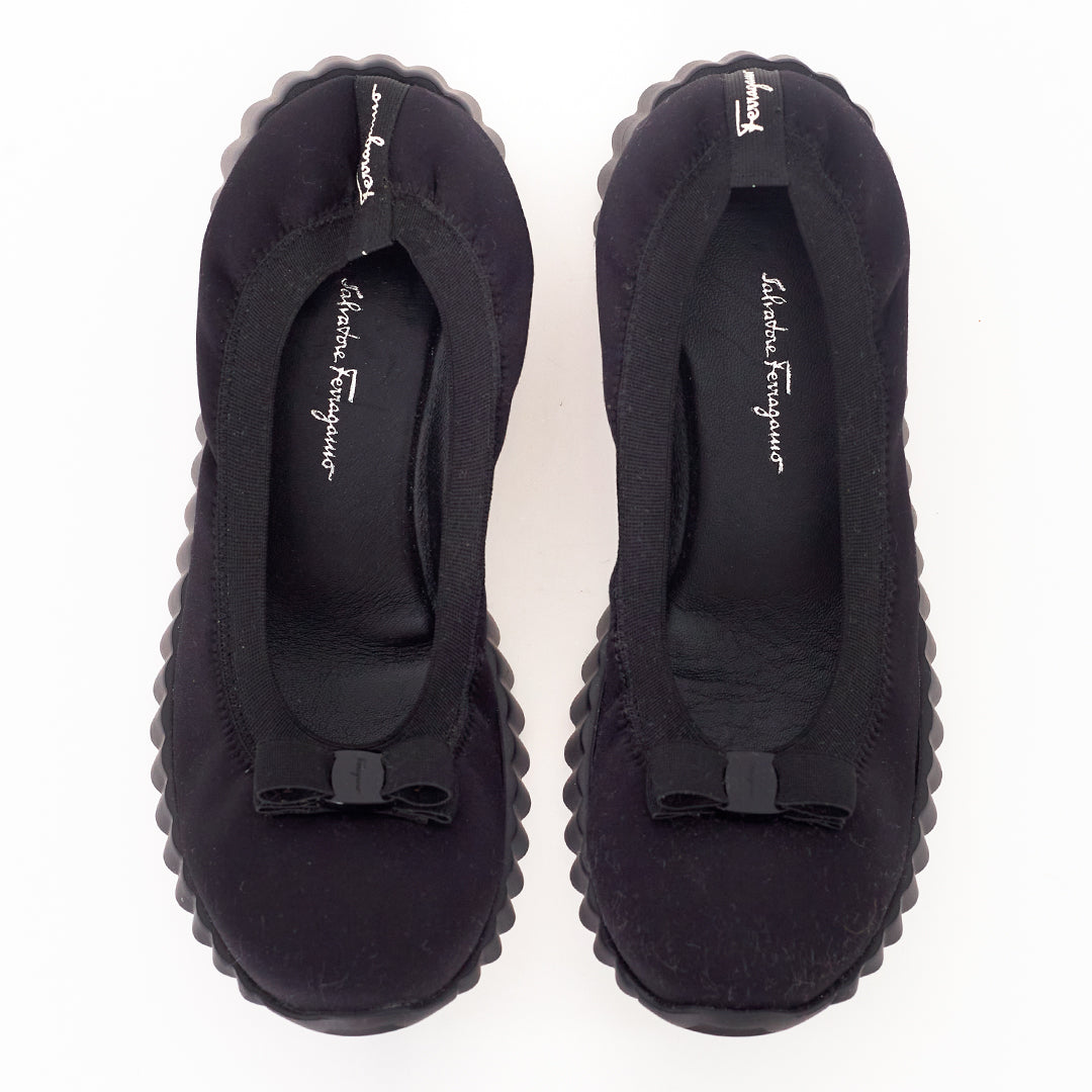 Detalhes: Sapato Salvatore Ferragamo confeccionado em tecido,couro e borracha na cor preta. Possui solado emborrachado flexível, elástico aplicado na parte superior e bico arredondado com laço aplicado. Elástico com nome da marca aplicado na parte traseira. Acompanha dustbag original da marca.