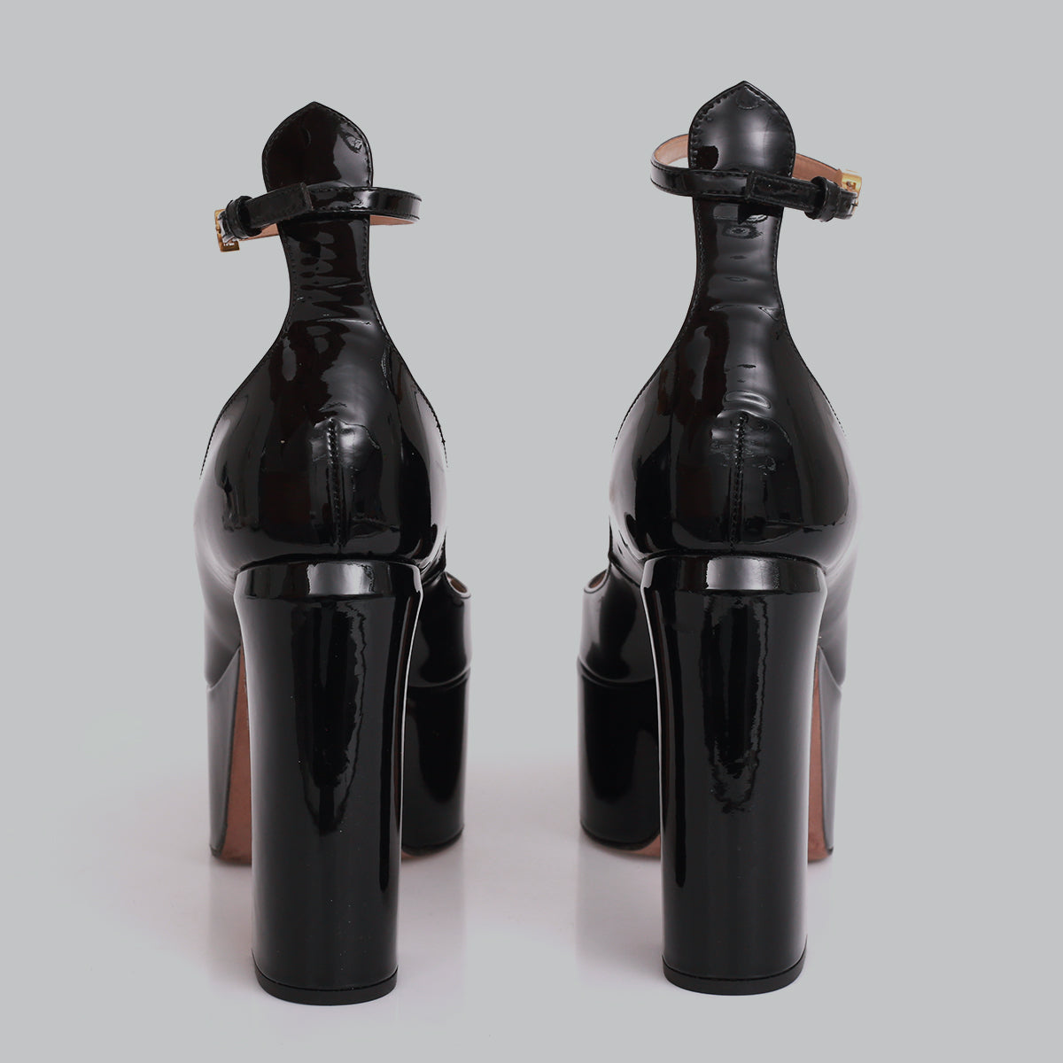 Detalhes: Sapato Valentino Tan-Go Plataform Pump confeccionada em couro envernizado na cor preta. Modelo possui bico arredondado, salo médio grosso, plataforma, posterior e laterais fechados. Fechamento em tira no tornozelo por fivela ajustável. *Acompanha caixa da marca.*