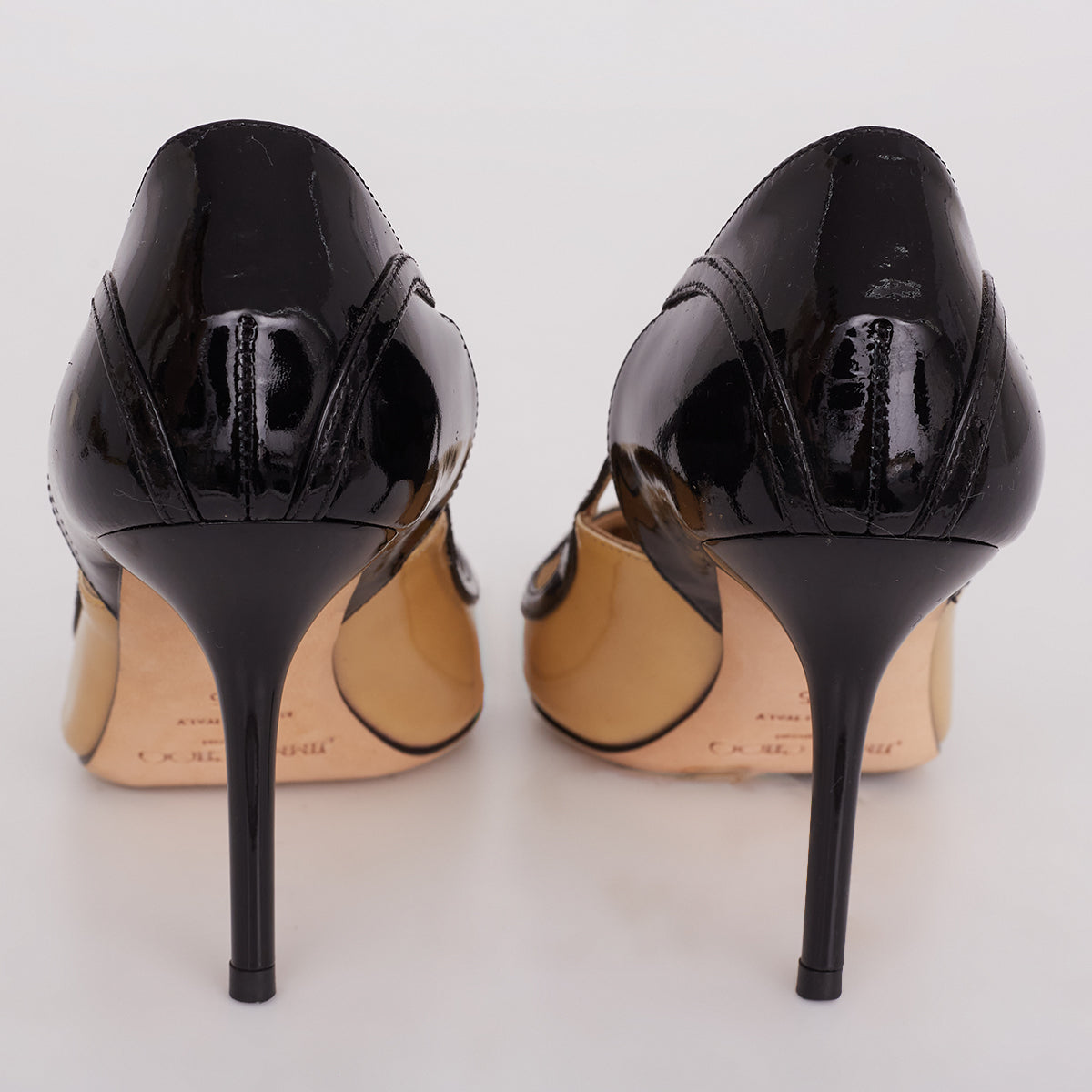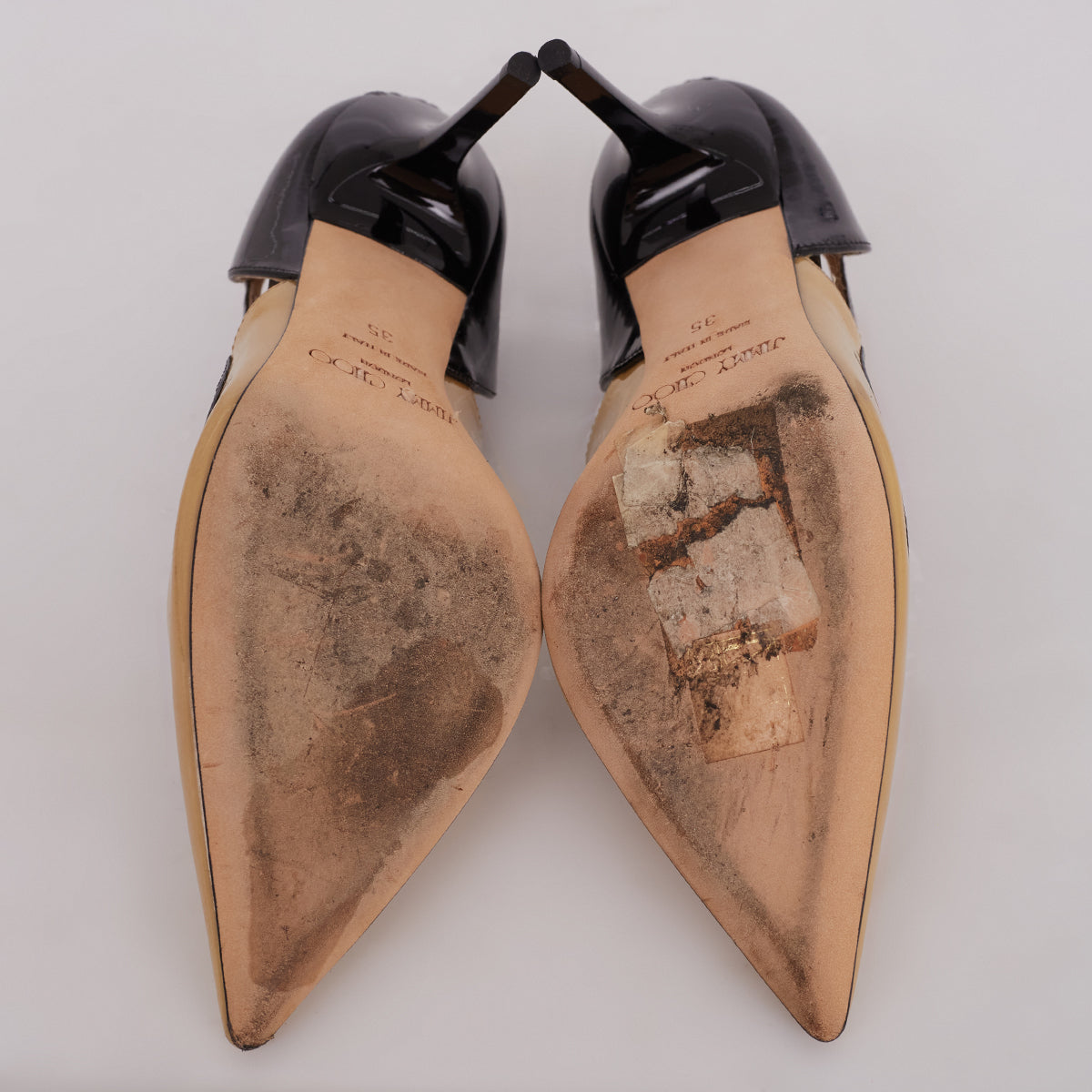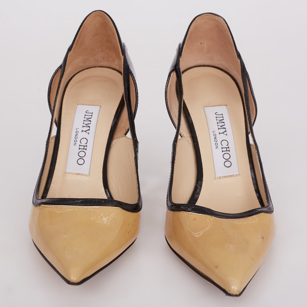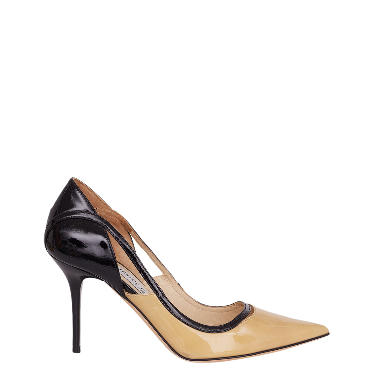 Detalhes: Scarpin Jimmy Choo em verniz na cor nude e preto. Possui salto alto e fino.