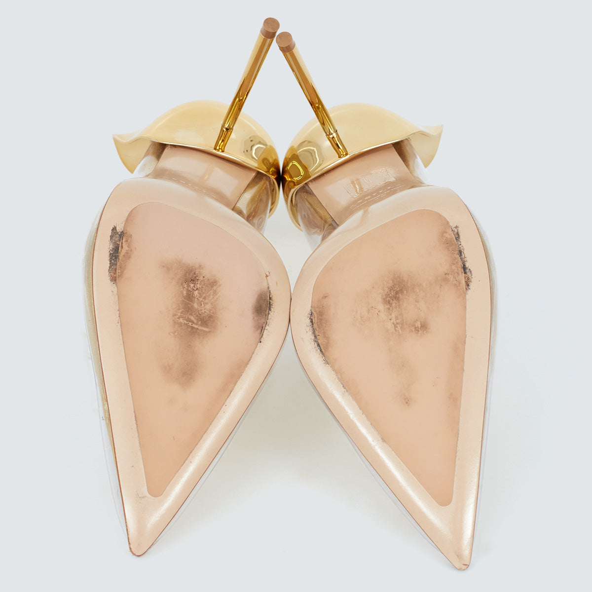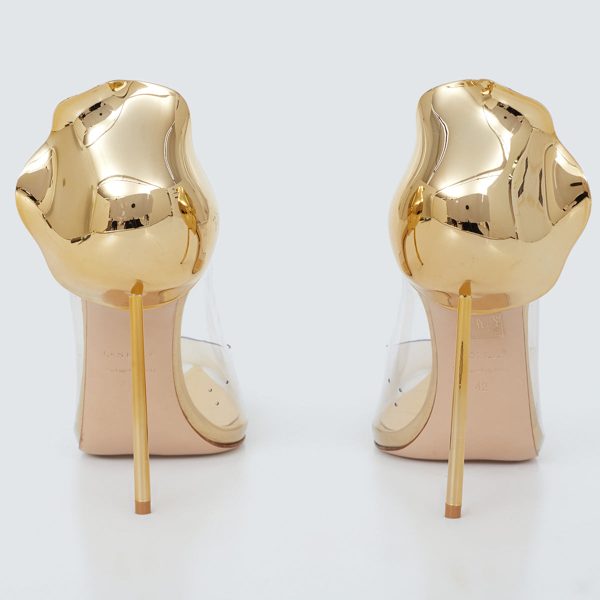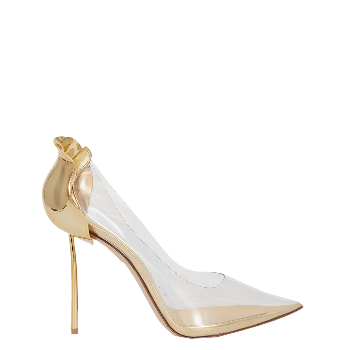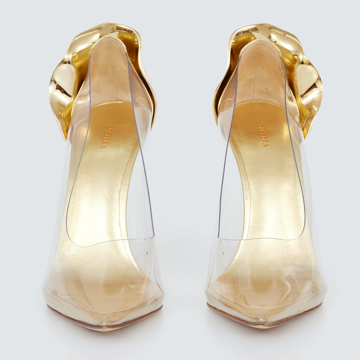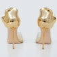 Detalhes: Sandália Lesilla confeccionada em couro na cor dourada e vinil. O modelo apresenta detalhe esculpido no calcanhar e salto agulha.