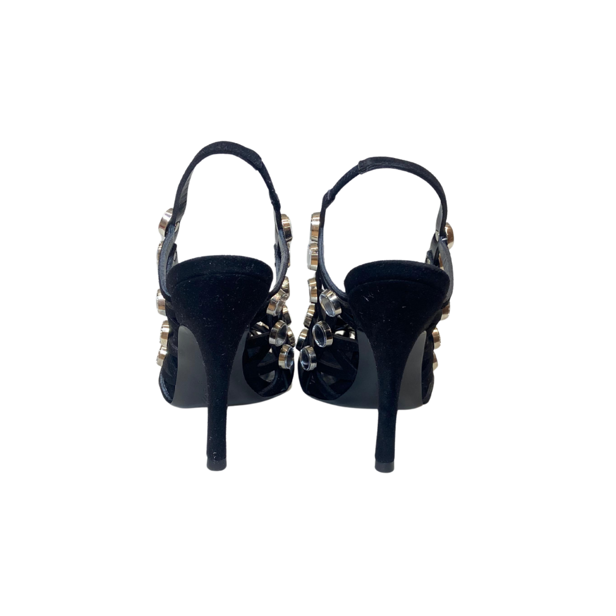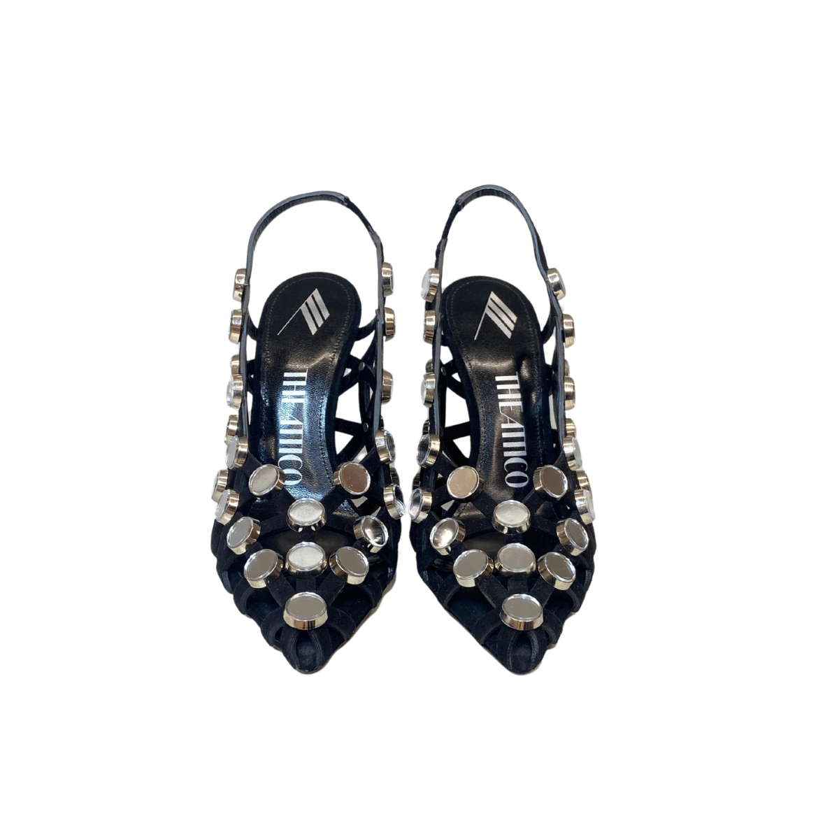 Detalhes: Scarpin The Attico confeccionado em veludo preto . Possui bico fino, salto alto fino, recorte em V na abertura do pé, laterais abertas, tira posterior e calcanhar aberto. Todo coberto por detalhes espelhados.