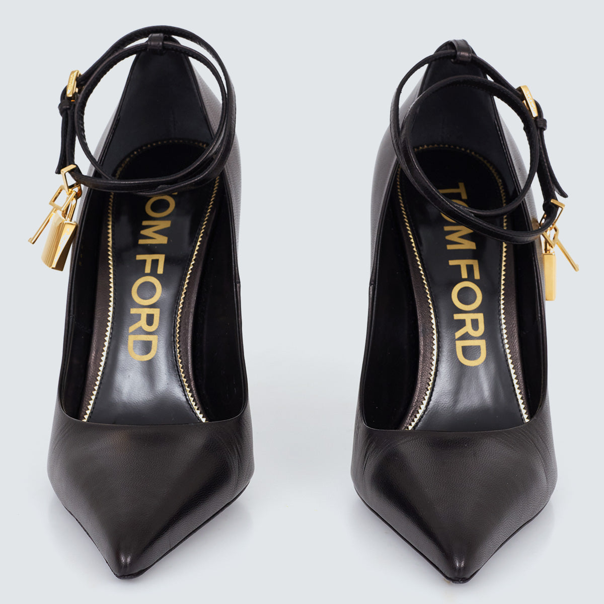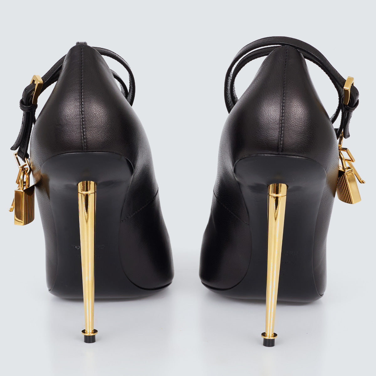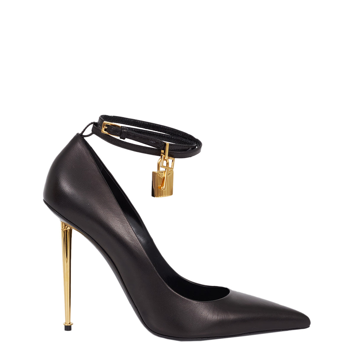 Detalhes: Scarpin Tom Ford, confeccionado em couro na cor preta. Possui salto metálico dourado e fechamento em fivela no tornozelo. Detalhe de cadeado dourado. Acompanha caixa da marca.