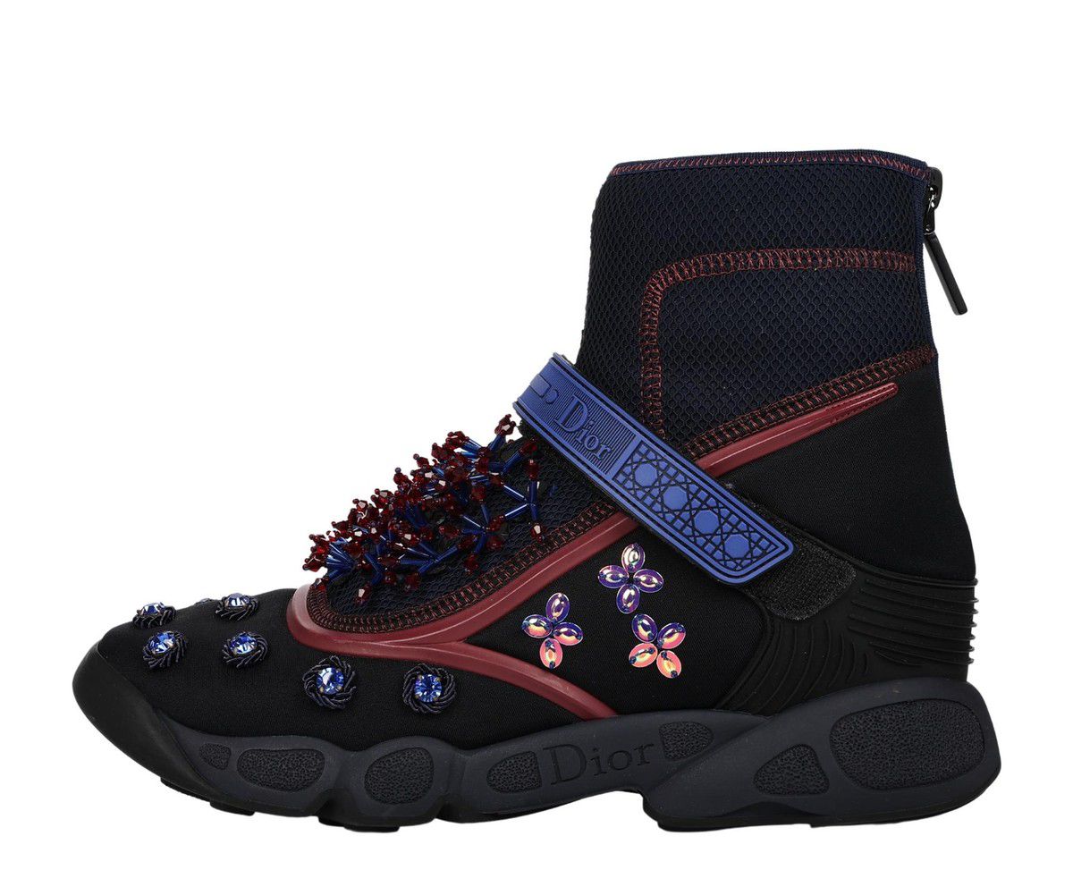 Detalhes: Tênis Dior confeccionado em tecido e borracha. Modelo possui bico arredondado, cano alto, detalhes em pedrarias, solado emborrachado e fechamento frontal por velcro e posterior por zíper.