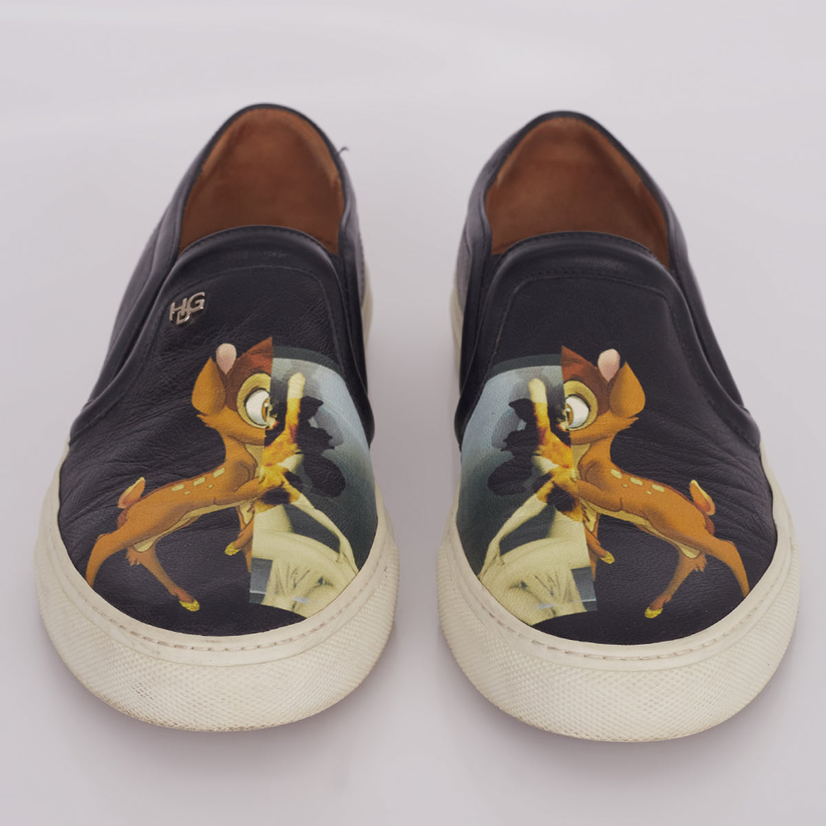 Detalhes: Tênis Givenchy confeccionado em couro. Modelo slip on, possui bico arredondado e solado flat em borracha. Contém a estampa do Bambi na parte frontal.