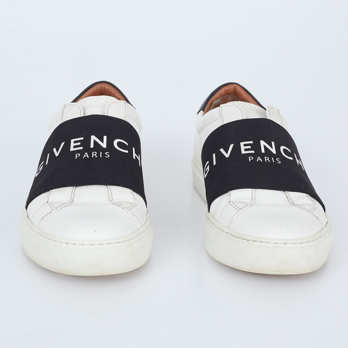 Detalhes: Tênis Tênis Givenchy feito em couro branco, modelo slip on, possui bico geométrico, elástico frontal preto com estampa da logo, nome da marca gravada na lingueta e posterior da peça, detalhe de dois nós posteriores e solado flat. Acompanha dust da marca.