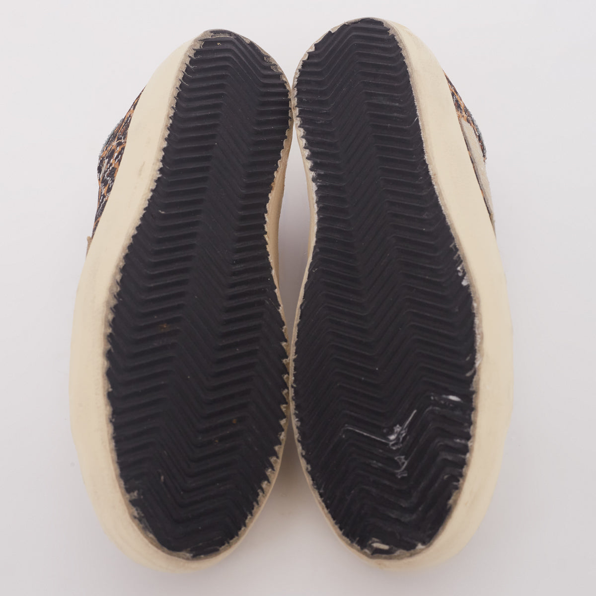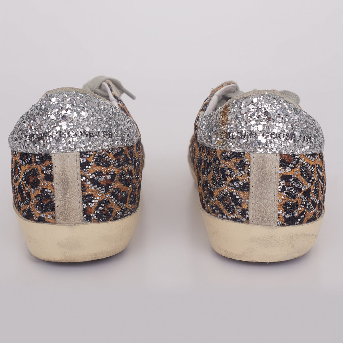 Detalhes: Tênis Golden Goose confeccionado em couro e tecido com estampa em animal print e glitter na cor prata. solado emborrachado na cor off-white roxa e estrela em couro branco. Possui bico arredondado e cadarço cinza. Acompanha dust bag original da marca.