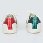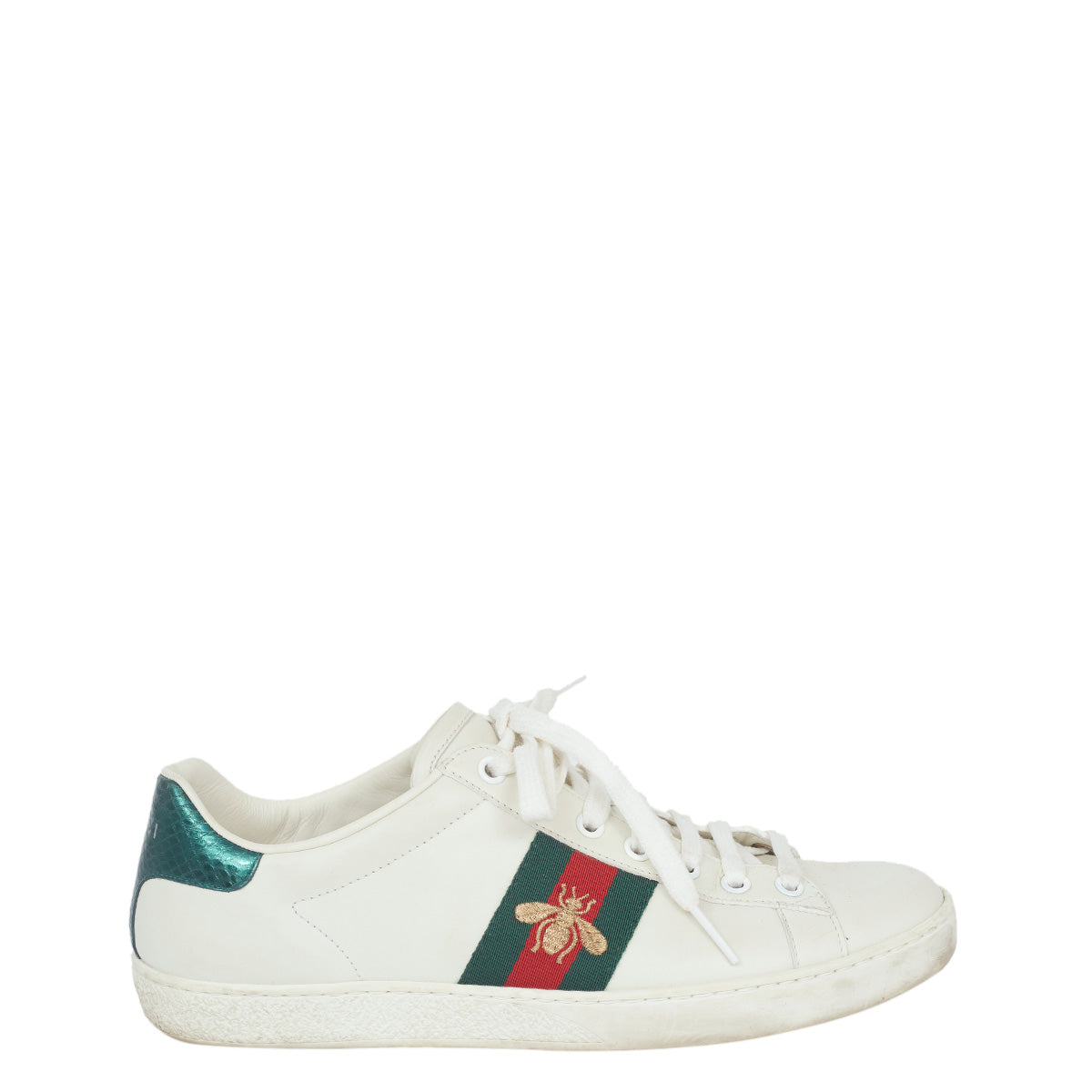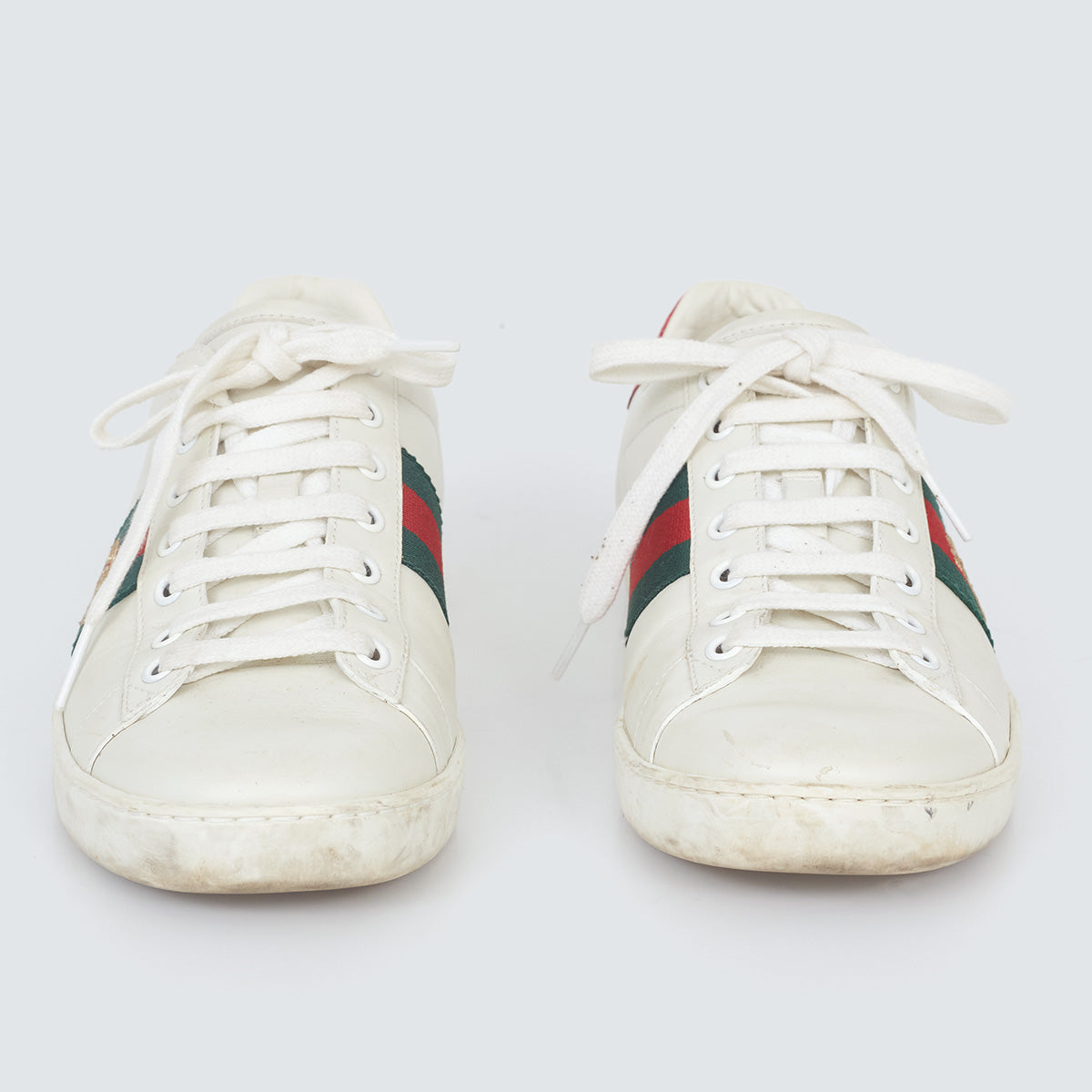 Detalhes: Tênis Gucci confeccionado em couro na cor branco. Possui bico redondo, solado flat de borracha, faixa Web verde e vermelha nas laterais e bordado dourado de abelha. Contém detalhe metalizado de couro vermelho em um calcanhar e verde no outro. Fechamento em cadarço.
