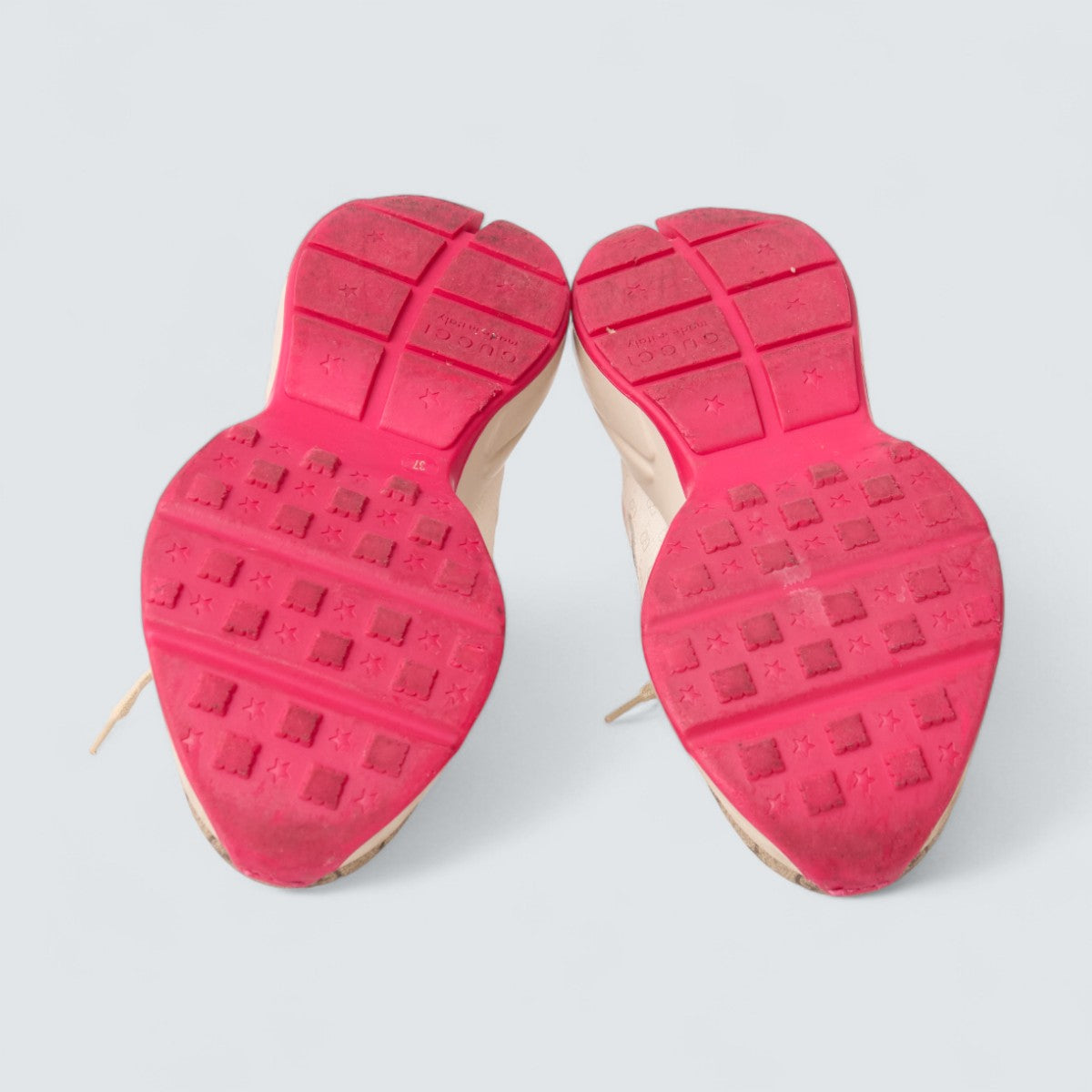 Detalhes: Tênis Gucci confeccionado em tecido e couro. O modelo É um tênis de cano baixo com um design "chunky" (robusto) e sola grossa. A parte superior é feita de uma mistura de materiais, incluindo o canvas com o monograma GG da Gucci em bege e ébano, com detalhes em couro ou tecido nas cores rosa claro, azul-marinho e branco. A sola de borracha é branca com a parte inferior em rosa choque