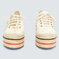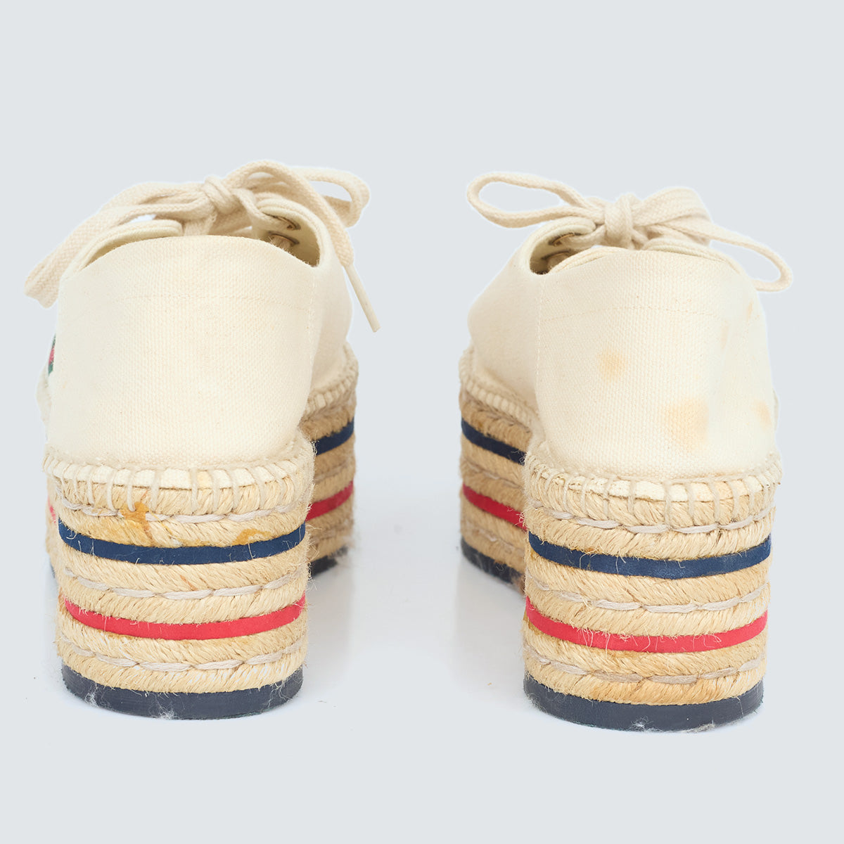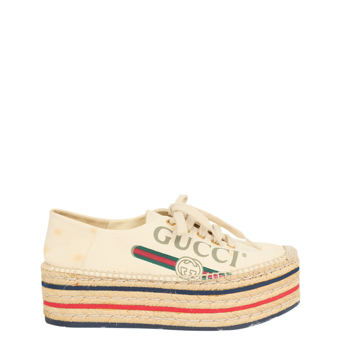 Detalhes: tênis Gucci confeccionado em linho. O modelo apresenta tecido externo em linho na cor off-white. modelo tem platarma com linhas marinho e vermelho no solado. fecho em amarração por cadarço.