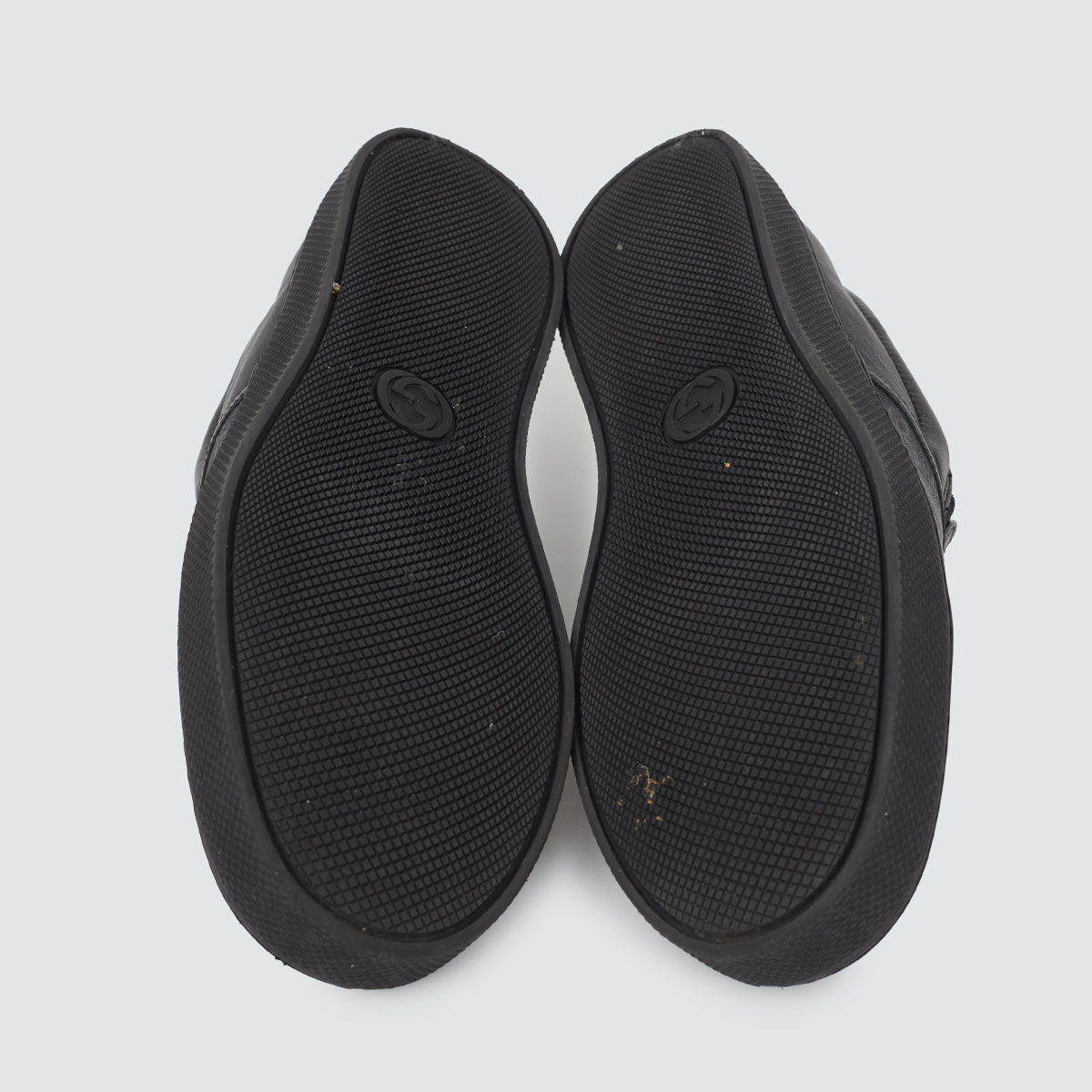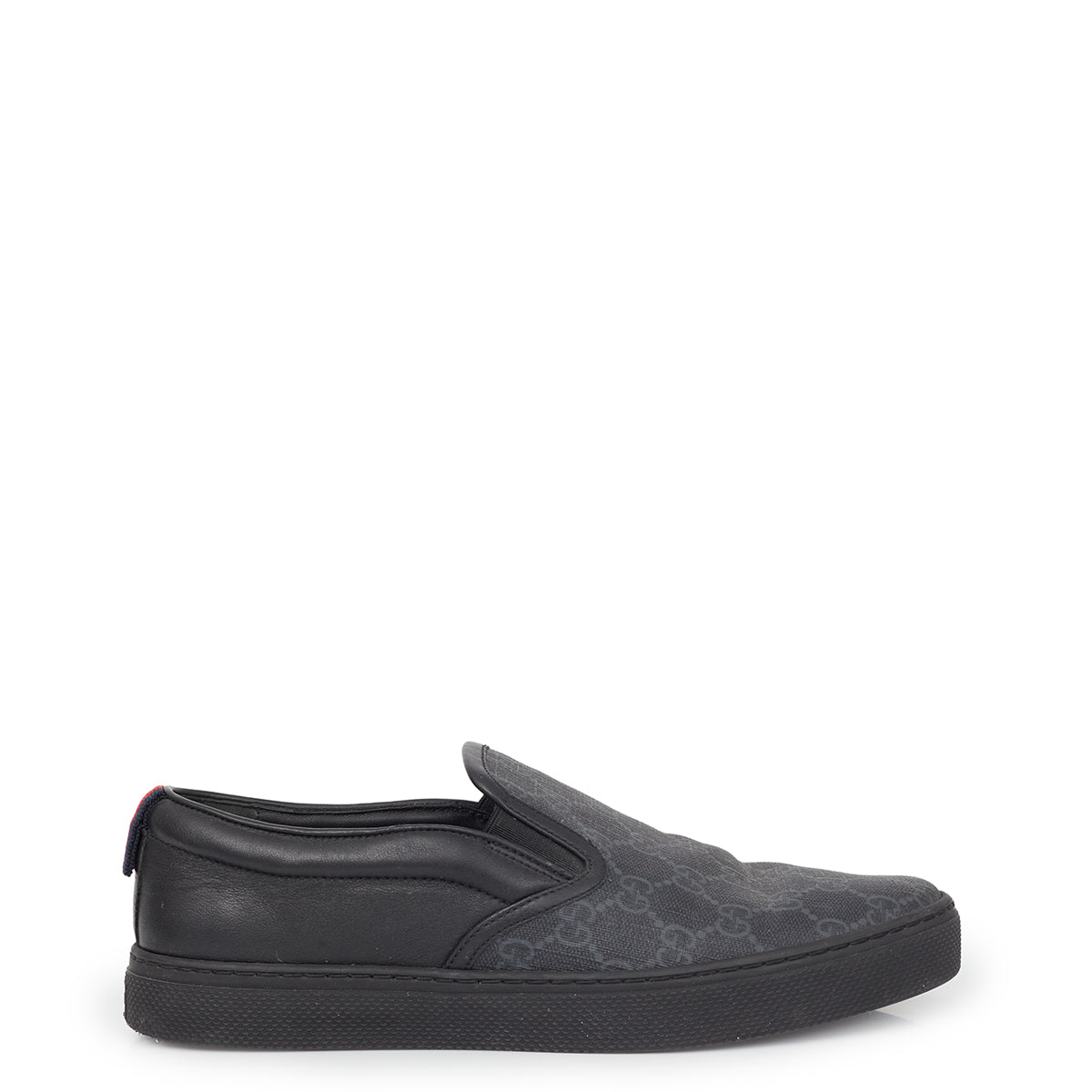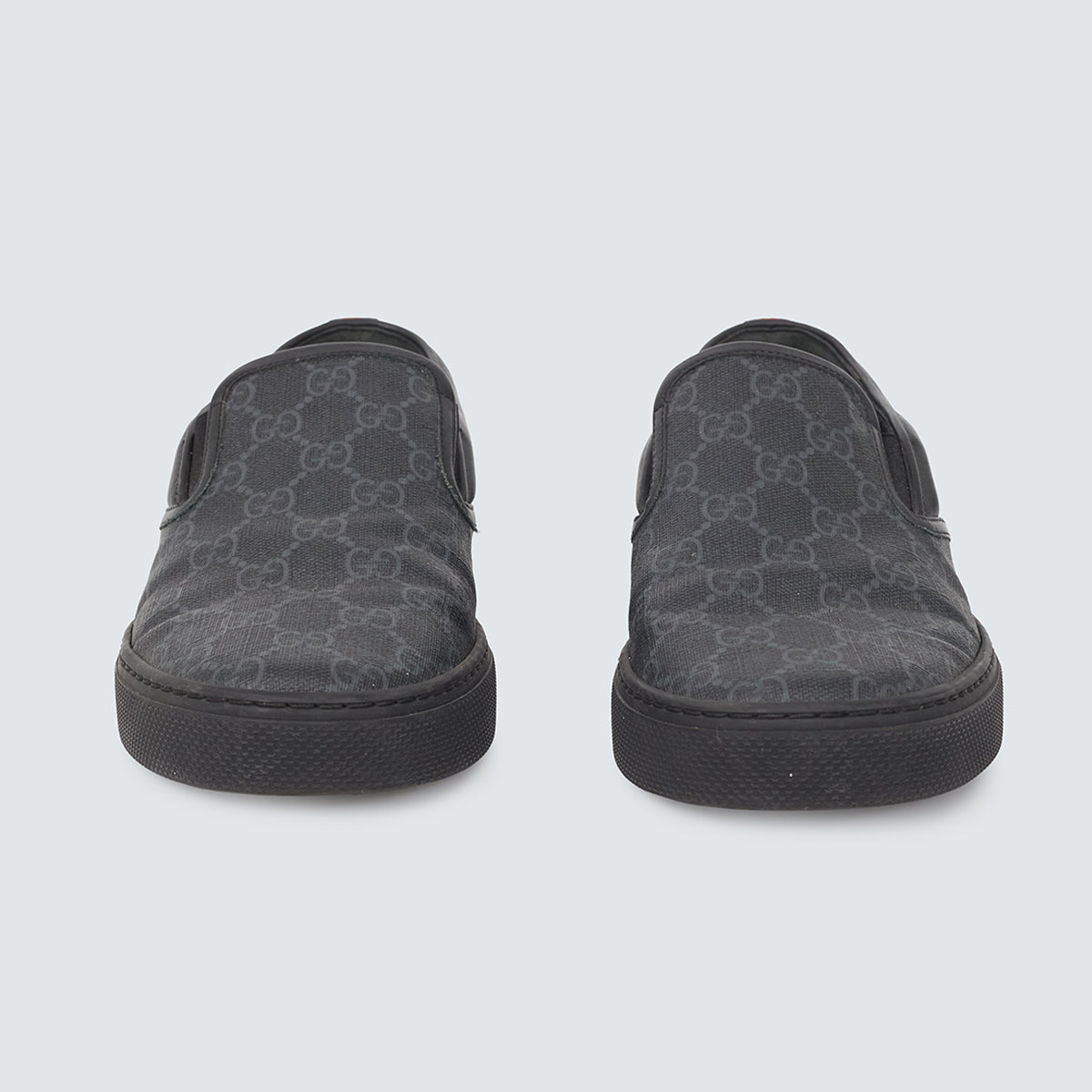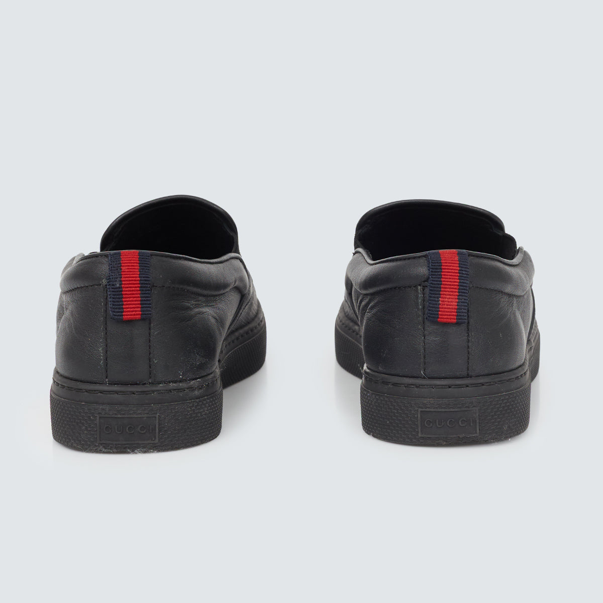 Detalhes: Tênis Gucci confeccionado em couro na cor preta. Modelo slip on, possui bico arredondado, monograma na parte frontal e posterior em couro preto liso, detalhe em tecido listrado em vermelho e azul marinho.