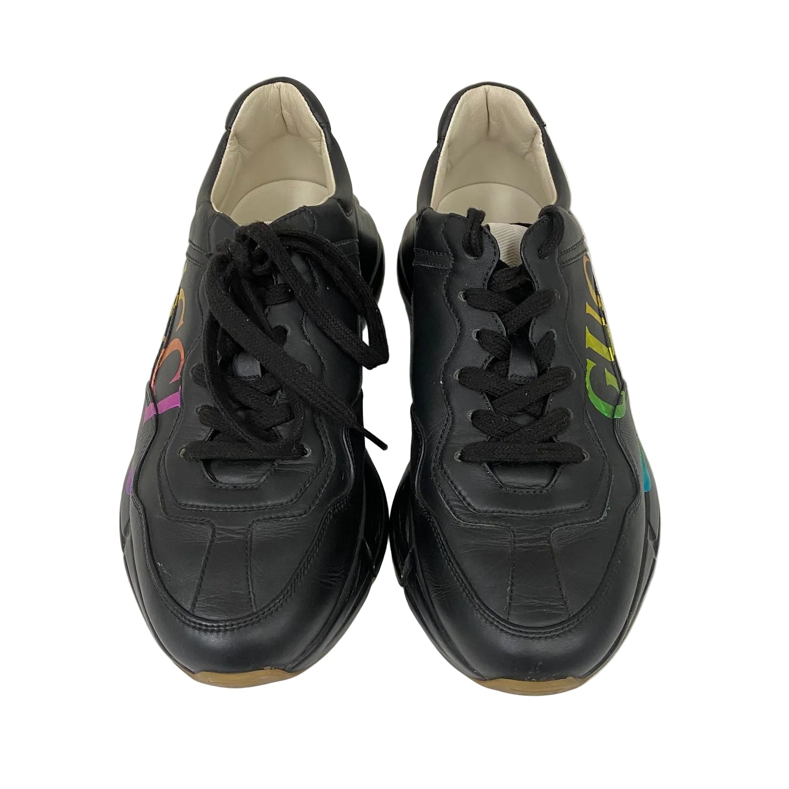 Detalhes: Tenis Gucci confeccionado em couro na cor preta com detalhe do nome da marca nas laterais colorido. Fechamento por cadarço na cor preta. Possui sola em borracha na cor preta.