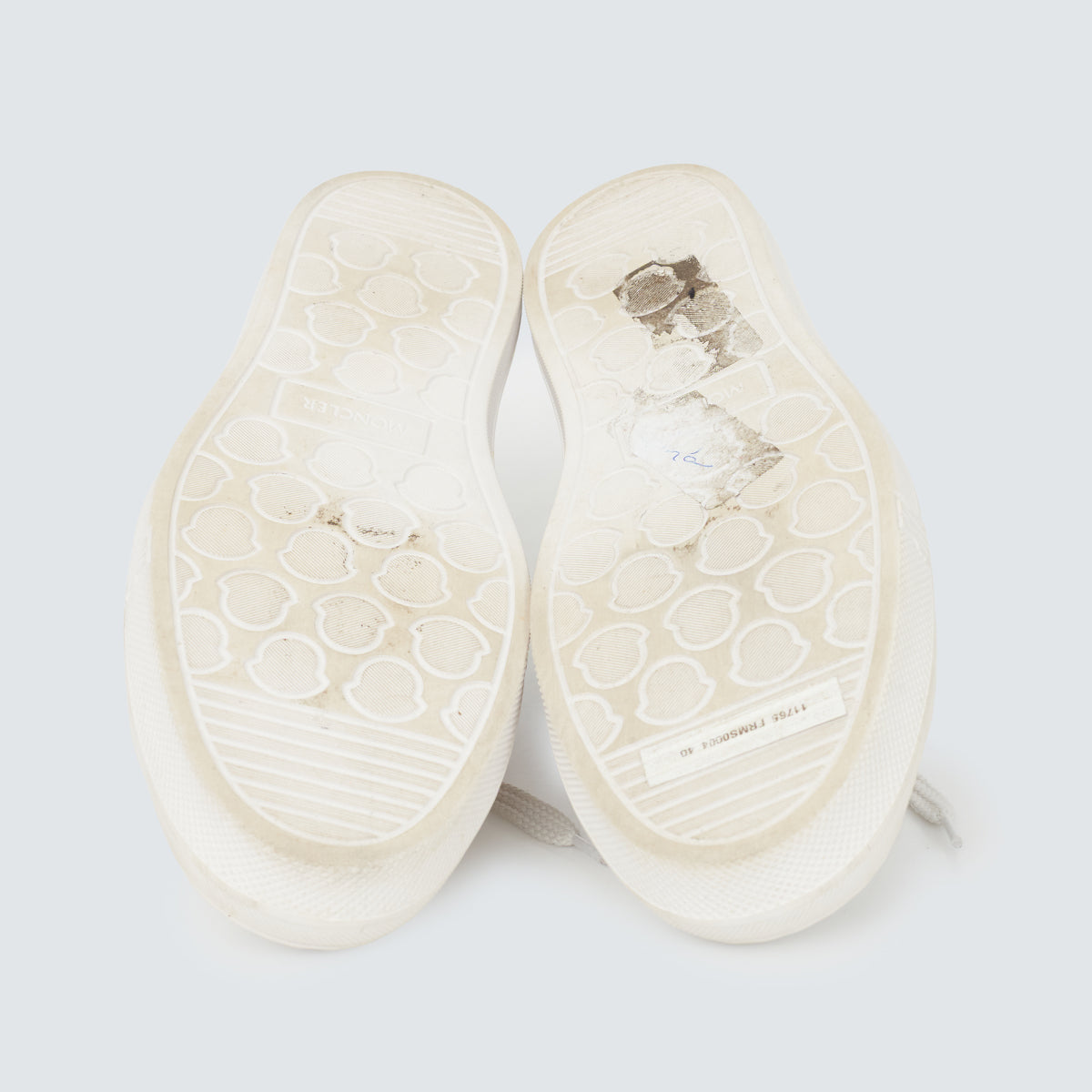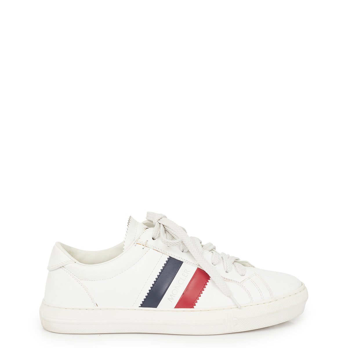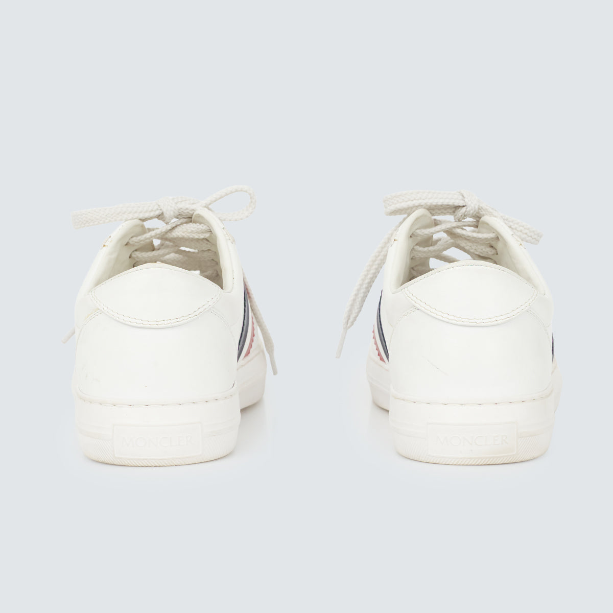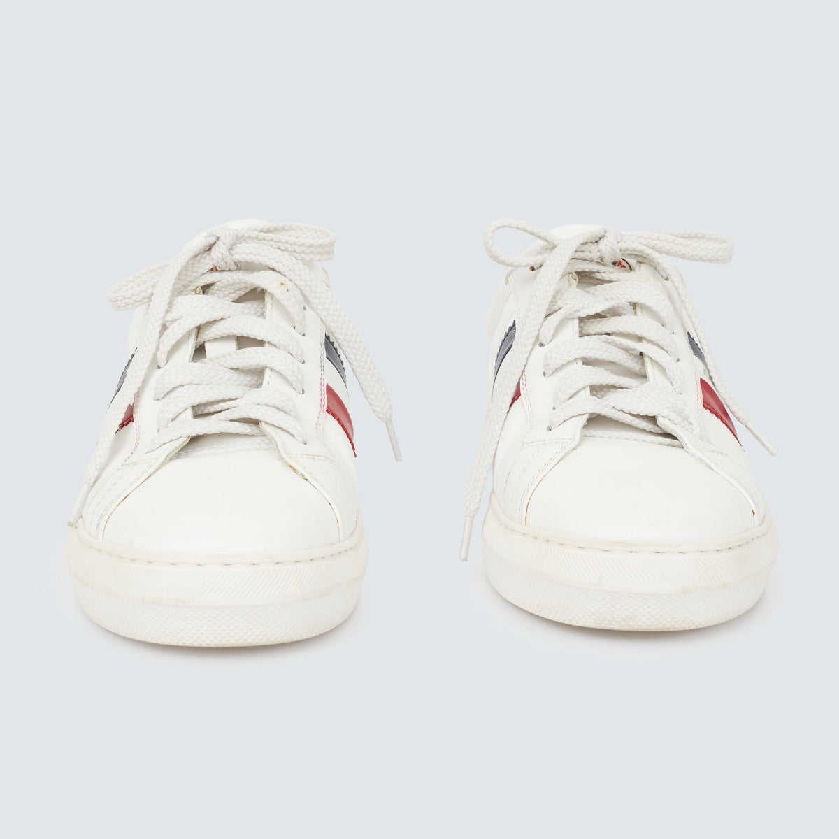 Detalhes: Tênis Moncler confeccionado em couro na cor branca. Modelo casual, solado flat, possui bico arredondado, faixa lateral em vermelho e marinho e fecho por amarração. Acompanha dust da marca.