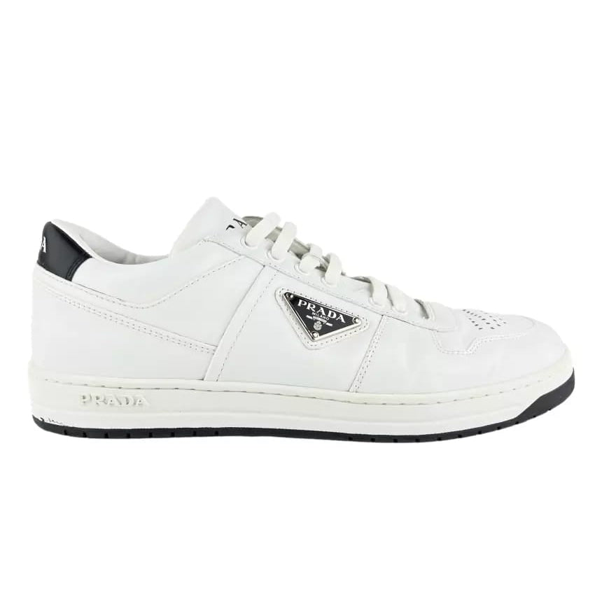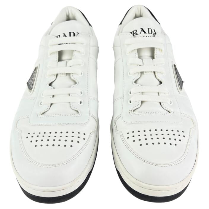 Detalhes: Tênis Prada confeccionado em couro na cor branca. Modelo possui bico arredondado e detalhe de logo nas laterais. Possui solado em borracha branca e preta. Fechamento em amarração com cadarço.