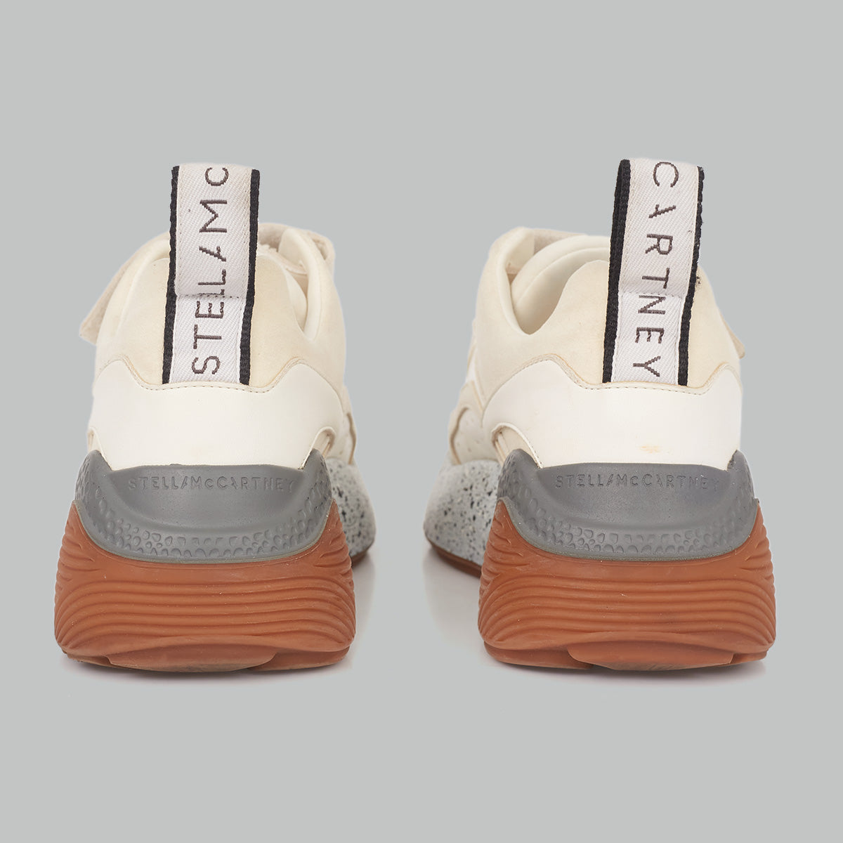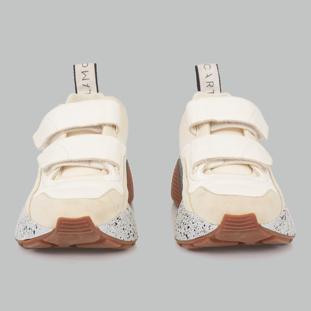 Detalhes: Tênis Stella McCarteney confeccionado em tecido bege e branco. Com solado em borracha, fechamento por duas tiras de velcro na frente, bico arredondado, detalhe em cinza na parte emborrachada, partes em camurça e nome da marca gravado na parte traseira.