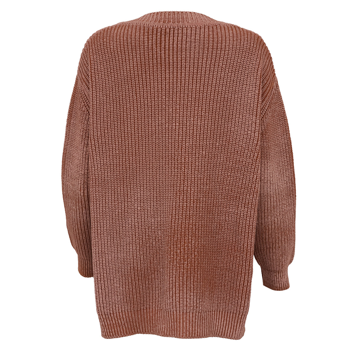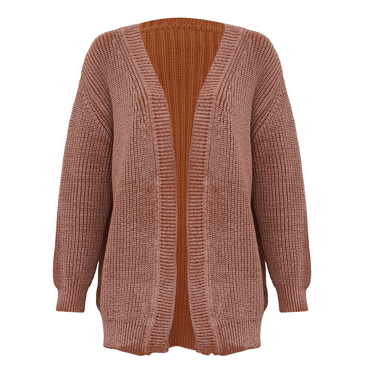 Detalhes: É um cardigan de frente aberta, sem botões ou zíperes. Possui um corte solto e alongado, que vai além da cintura. A peça tem uma textura de malha canelada, visível em todo o corpo e nas mangas. A cor é um tom neutro de rosa queimado.