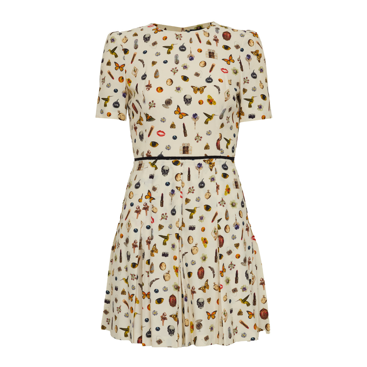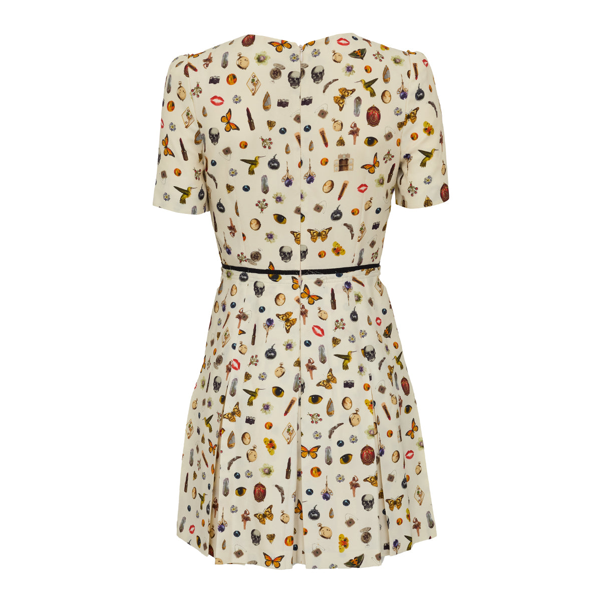 Detalhes: Vestido Alexander McQueen confeccionado em viscose e forro em seda. O modelo possui modelagem acinturada, detalhe plissado na saia e estampas variadas de borboleta, batom, caveira, flores e etc. Fecho em zíper invisível na parte das costas.