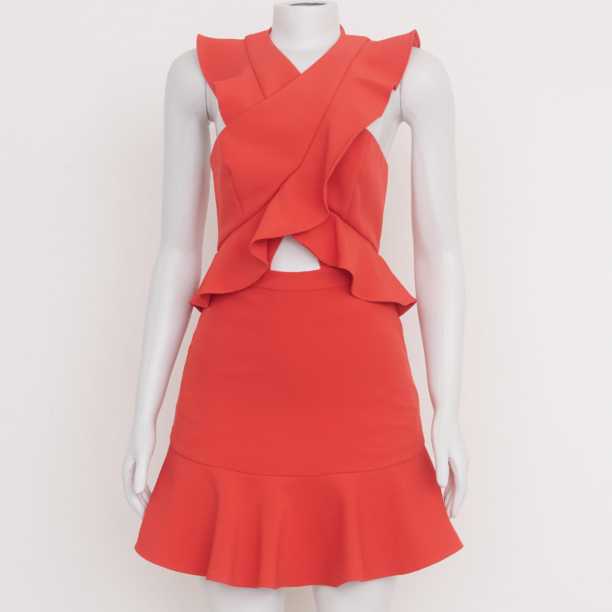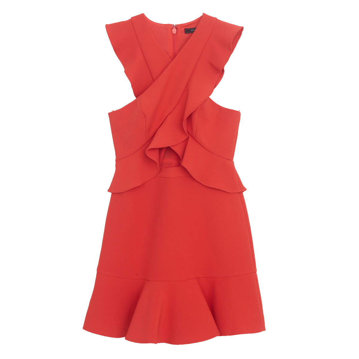 Detalhes: Vestido BCBGMaxazria em vermelho, possui modelagem acinturada, fecho dianteiro por zíper invisível, decote em V, recortes nas laterais, detalhe transpassado com babados frontais.